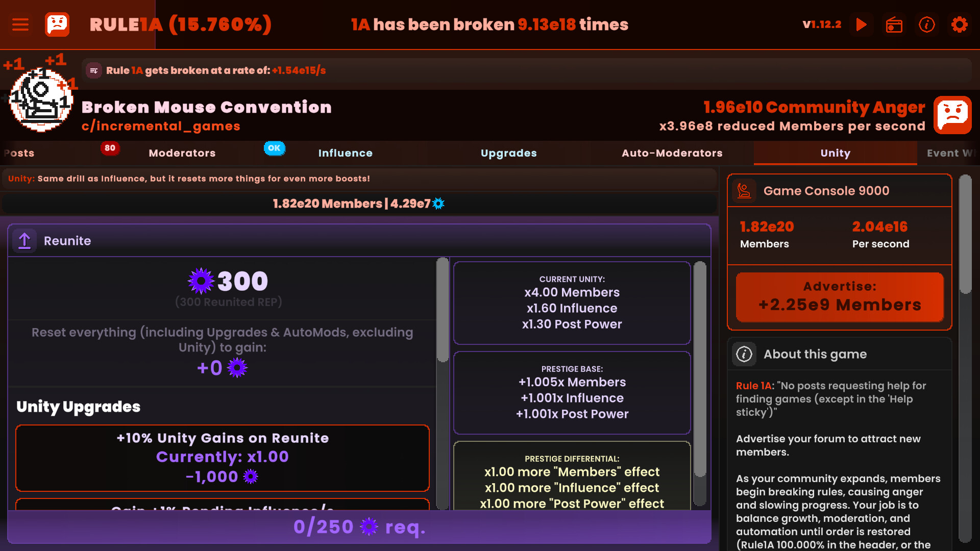 Community AngerCommunity Anger increases every time rules are broken. Higher anger reduces member gains exponentially. Anger can only be reset through prestige, making short-term and long-term planning essential.