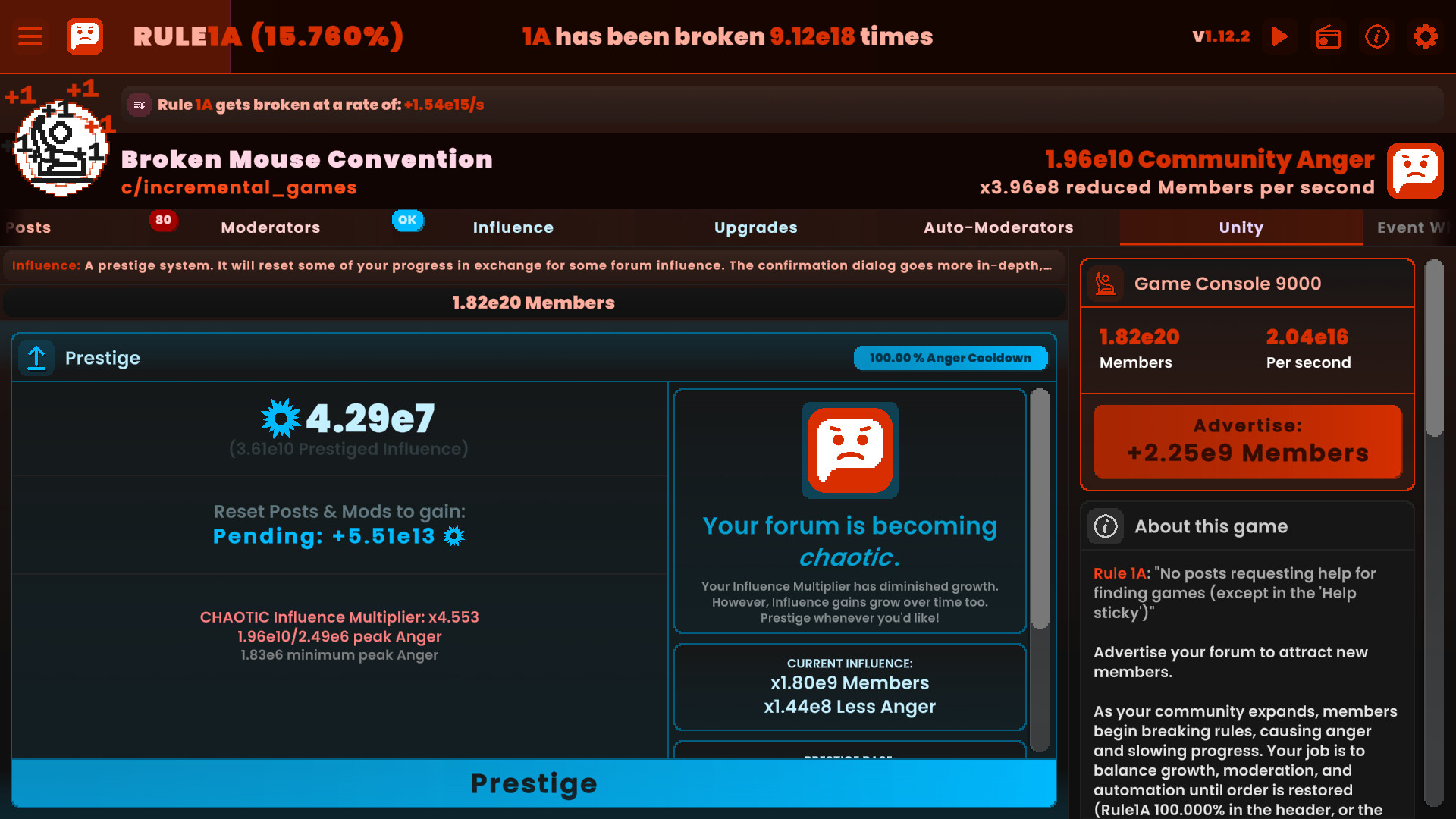 Community AngerCommunity Anger increases every time rules are broken. Higher anger reduces member gains exponentially. Anger can only be reset through prestige, making short-term and long-term planning essential.