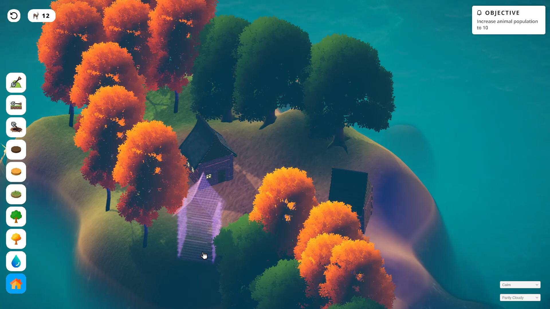 Create welcoming habitats for gentle animals by shaping terrain, placing vegetation, and providing water. Different creatures are drawn to different environments, settling in naturally as your island grows and changes.