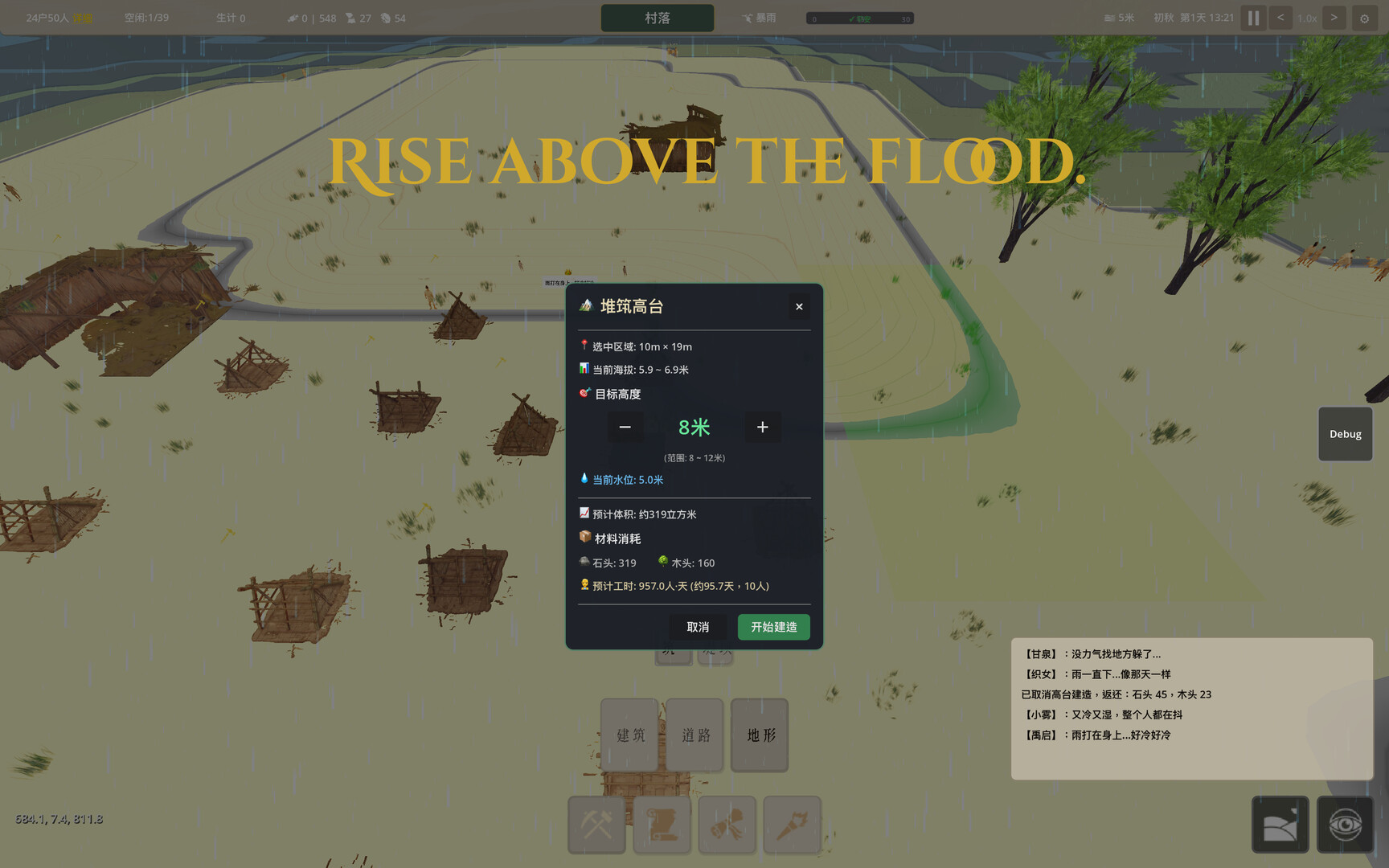 The flood is your enemy; the terrain is your ally. Build platforms to escape the water, construct dams to protect your home, plan your village on the rolling hills — shape survival with your own hands.