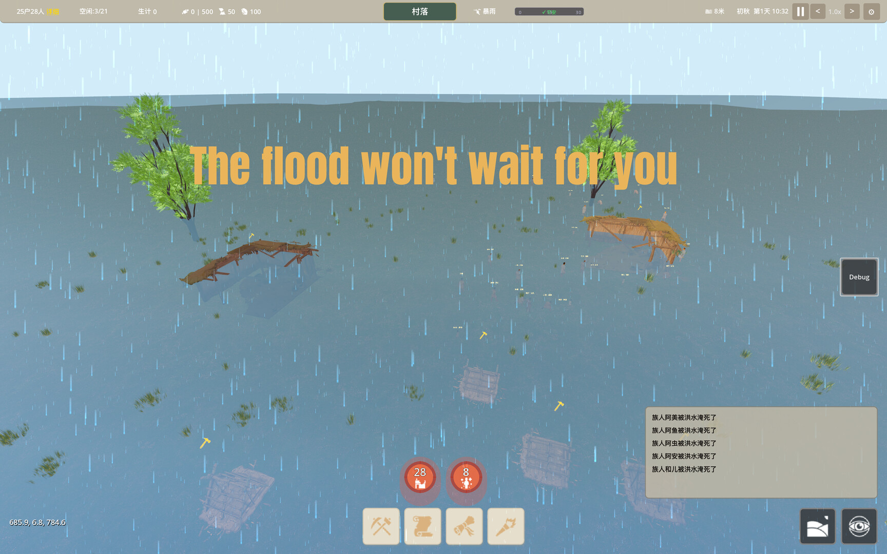 The flood is your enemy; the terrain is your ally. Build platforms to escape the water, construct dams to protect your home, plan your village on the rolling hills — shape survival with your own hands.
