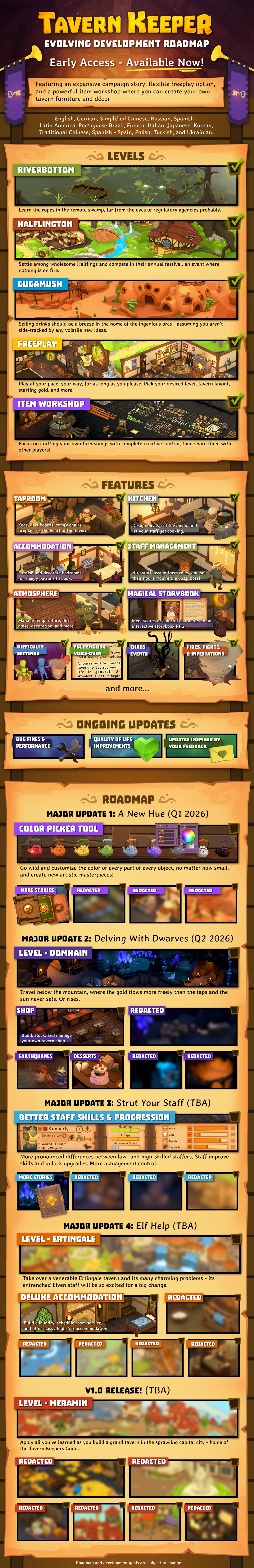 “We plan to add three more campaign (and freeplay) levels, along with new tavern features up to a 5-star tavern. See our Early Access Roadmap for more information on our intentions.”
