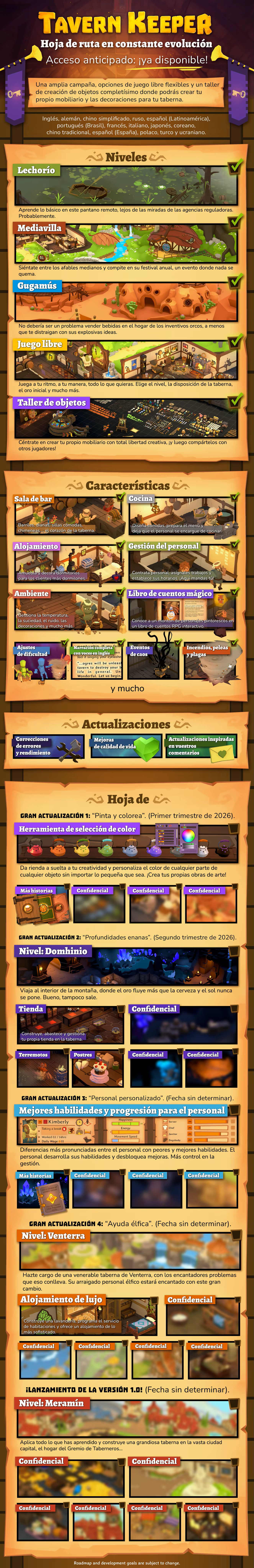 “Queremos añadir tres niveles más a la campaña (y al juego libre), así como nuevas funciones para tabernas de hasta 5 estrellas. Consulta la hoja de ruta del acceso anticipado para más información sobre nuestro plan.”