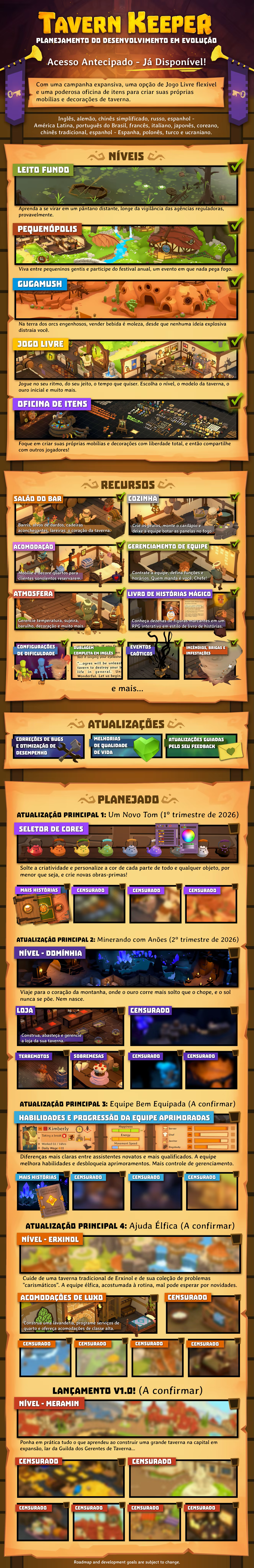 "Nosso primeiro jogo se beneficiou muito do feedback dos jogadores. Tavern Keeper já recebeu vários retoques, mas entender como o público interage com o jogo e colaborar com a comunidade para incorporar o feedback resultará em uma experiência ainda melhor para todos. O Acesso Antecipado também nos dá a chance de deixar os cenários posteriores do jogo tão caprichados quanto o conteúdo inicial antes do lançamento definitivo."