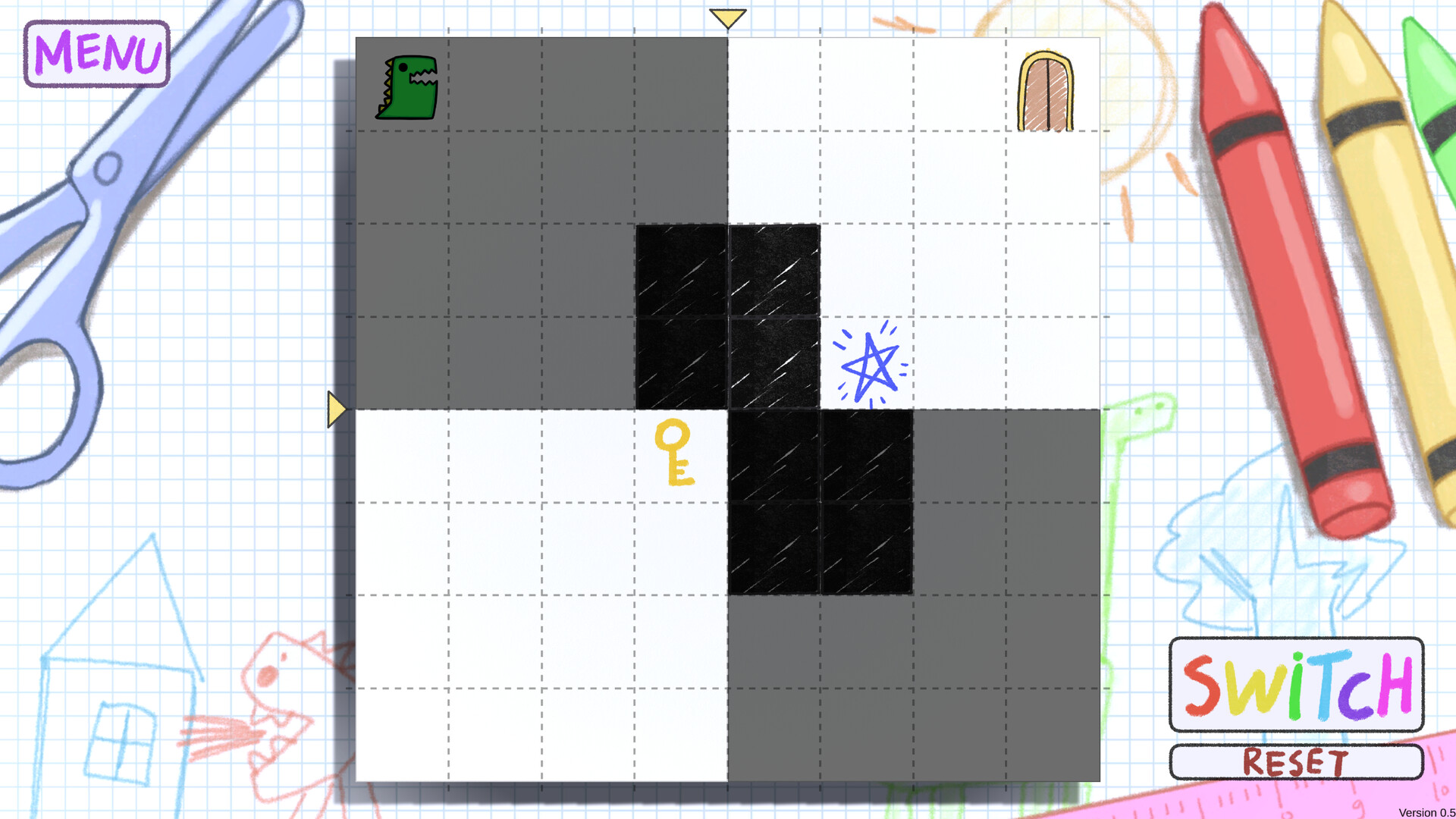 A dinosaur trapped in a paper world. Use decalcomania to duplicate tiles, build a path, and escape!