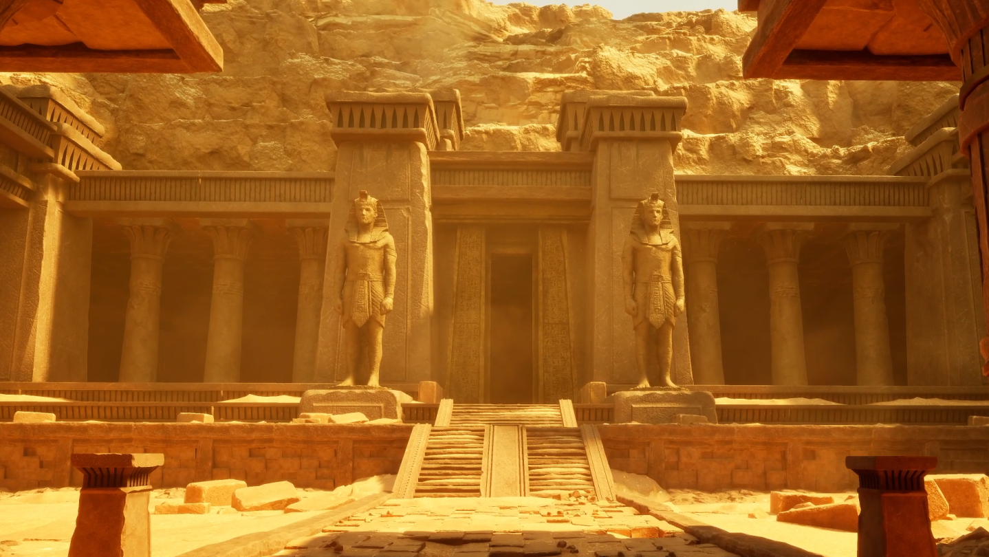 You alternate between two characters: an archaeologist exploring the temple in 3D, and a character evolving inside the 2D frescoes on the walls. To progress, you must switch between them to advance both characters.