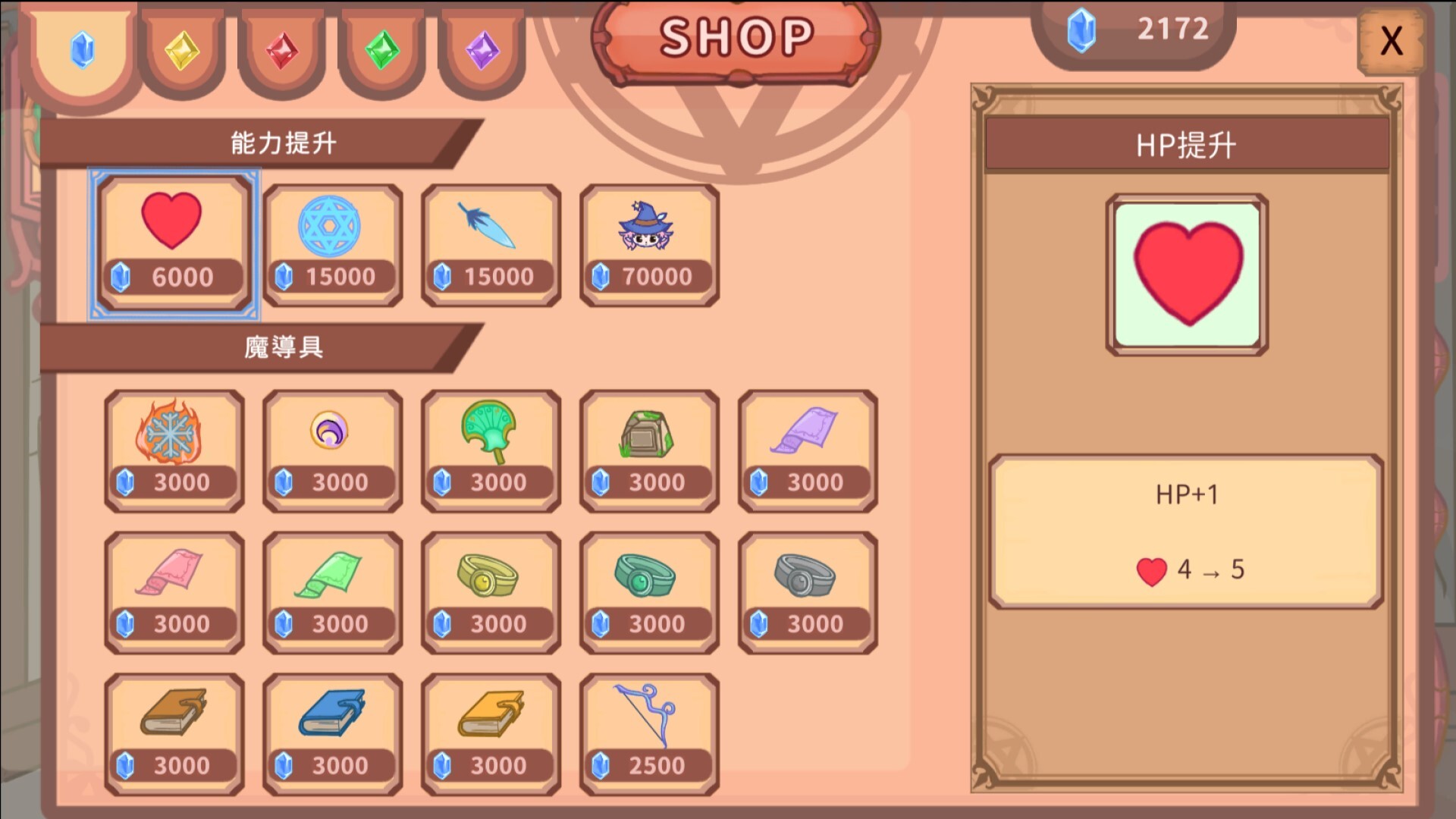 擊敗敵人後有機會會掉落水晶或寶石,可用於在商店支付來永久提升角色能力或解鎖更多魔導具。