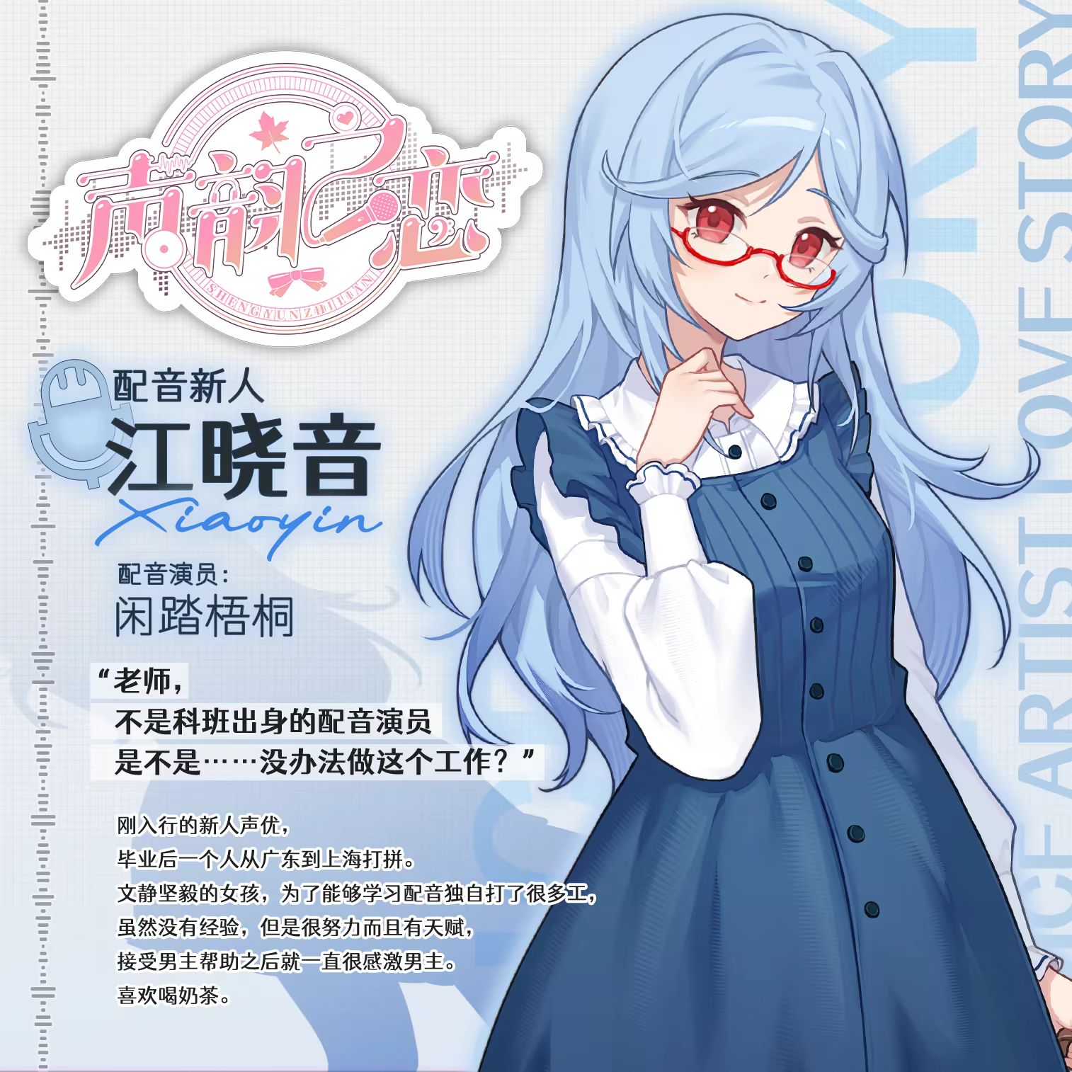 已经入行一年多有过儿童番工作经验的配音演员,但是后续转型困难,接不到合适工作。一开始比较怕生,但是熟悉以后会发现她是个活泼可爱的萌妹,对待配音工作非常的认真,喜欢吃甜食。