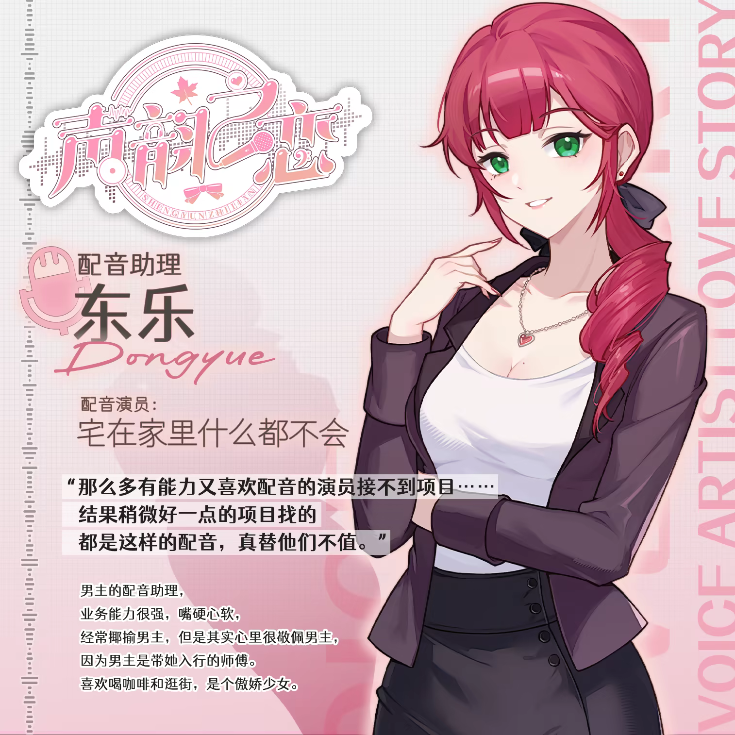 男主的配音助理,业务能力很强,嘴硬心软,经常揶揄男主,但是其实心里很敬佩男主,因为男主是带她入行的师傅。喜欢喝咖啡和逛街,是个傲娇少女。
