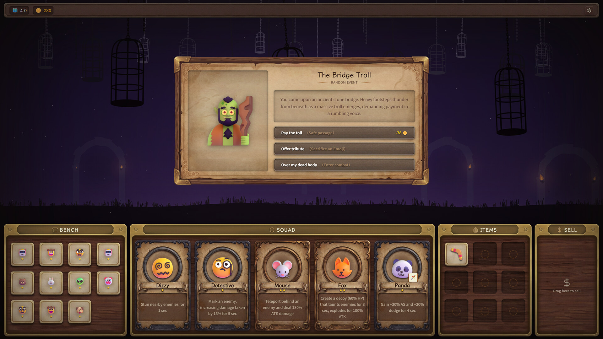 A Roguelike Auto-Chess strategy adventure game where every run features a different path. Recruit Emojis to build your squad, equip them with weapons, acquire game-changing relics, engage in automated battles, and encounter random events. Traverse five unique worlds and try to survive until the end.