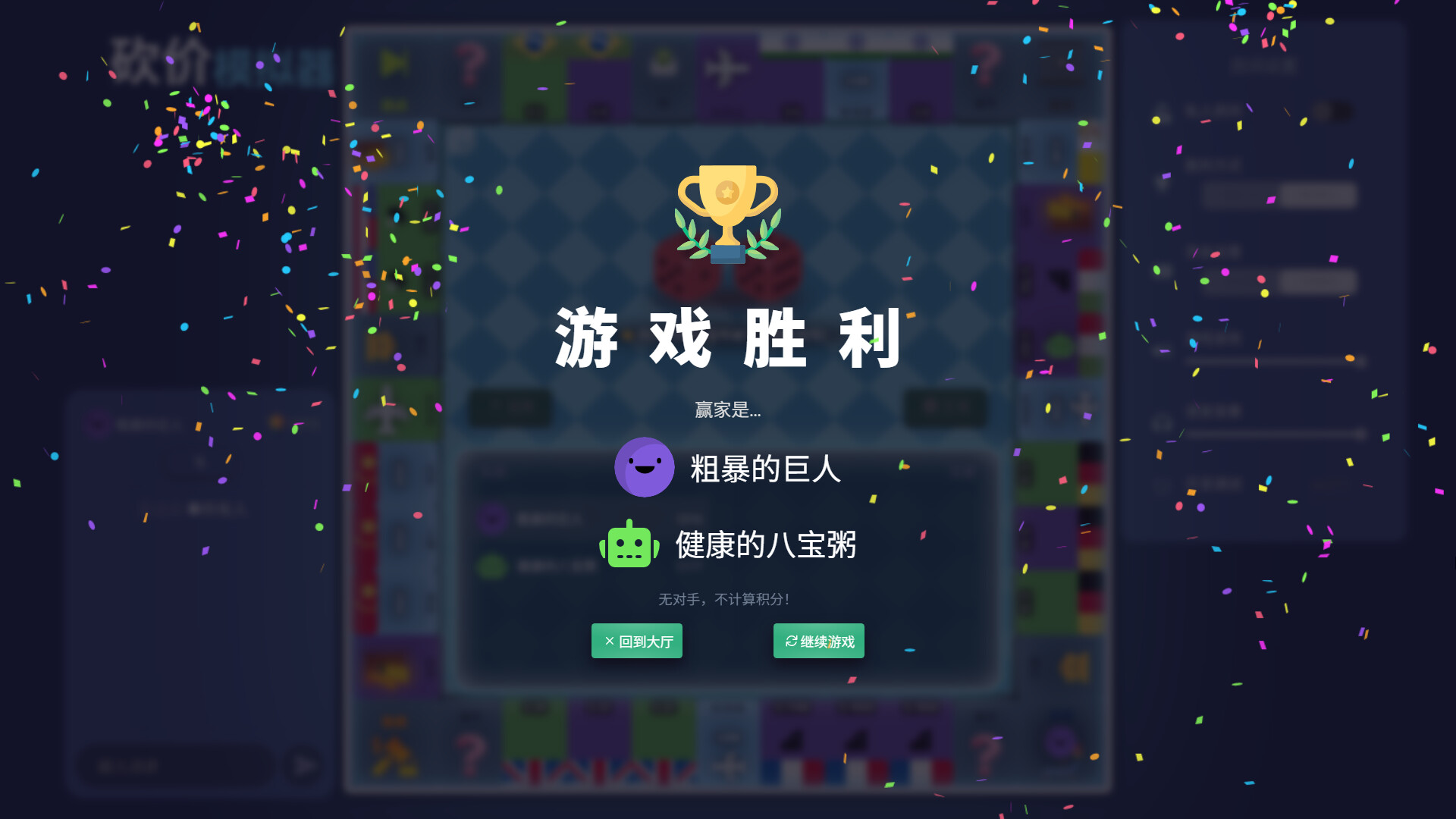 类大富翁桌游版,聚焦于玩家间的谈判、交易、竞价。 可以向银行申请贷款,但小心,逾期会被回收资产! 可群聊和私聊交易,避免人多口杂。 快来磨练你的砍价技巧吧!