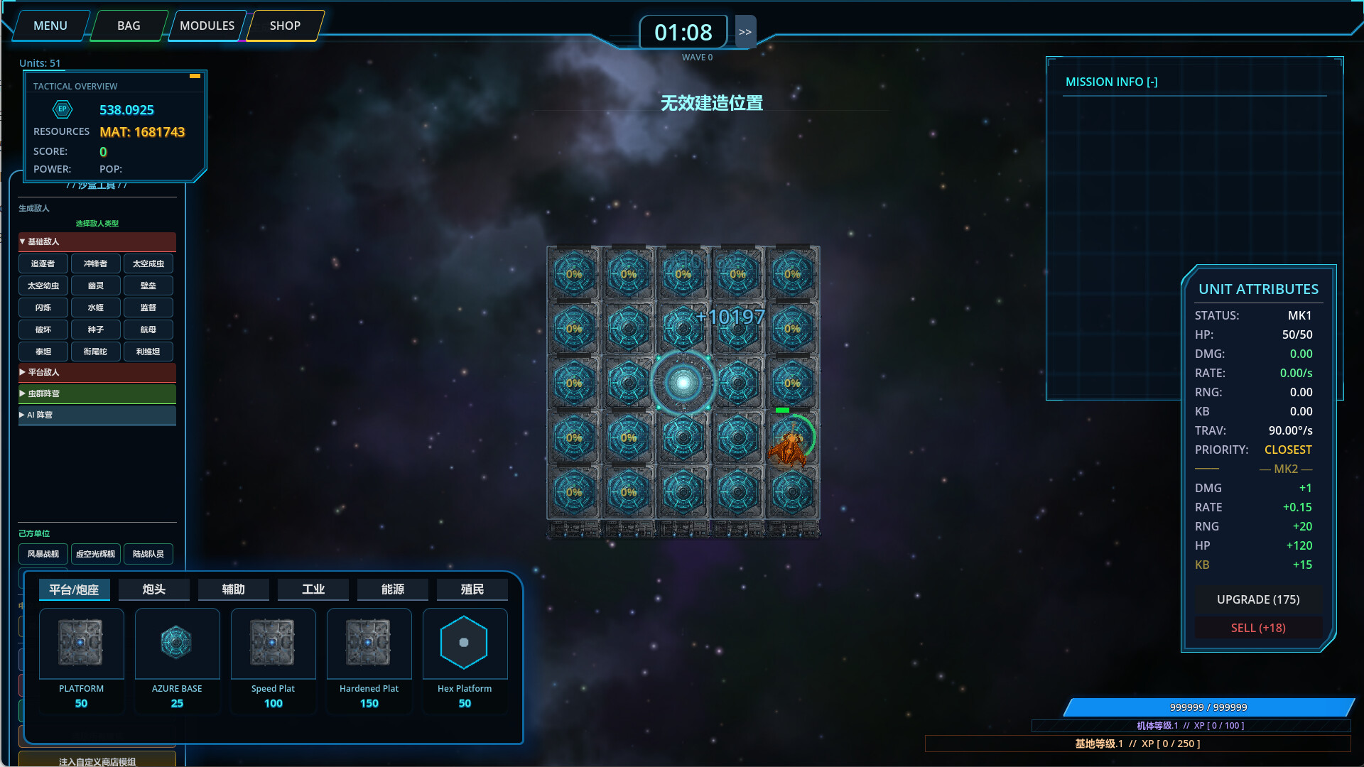 • Mobile Base Mode — Your base platform is equipped with four-directional thrusters. Use WASD to maneuver your entire base around the battlefield to evade attacks.