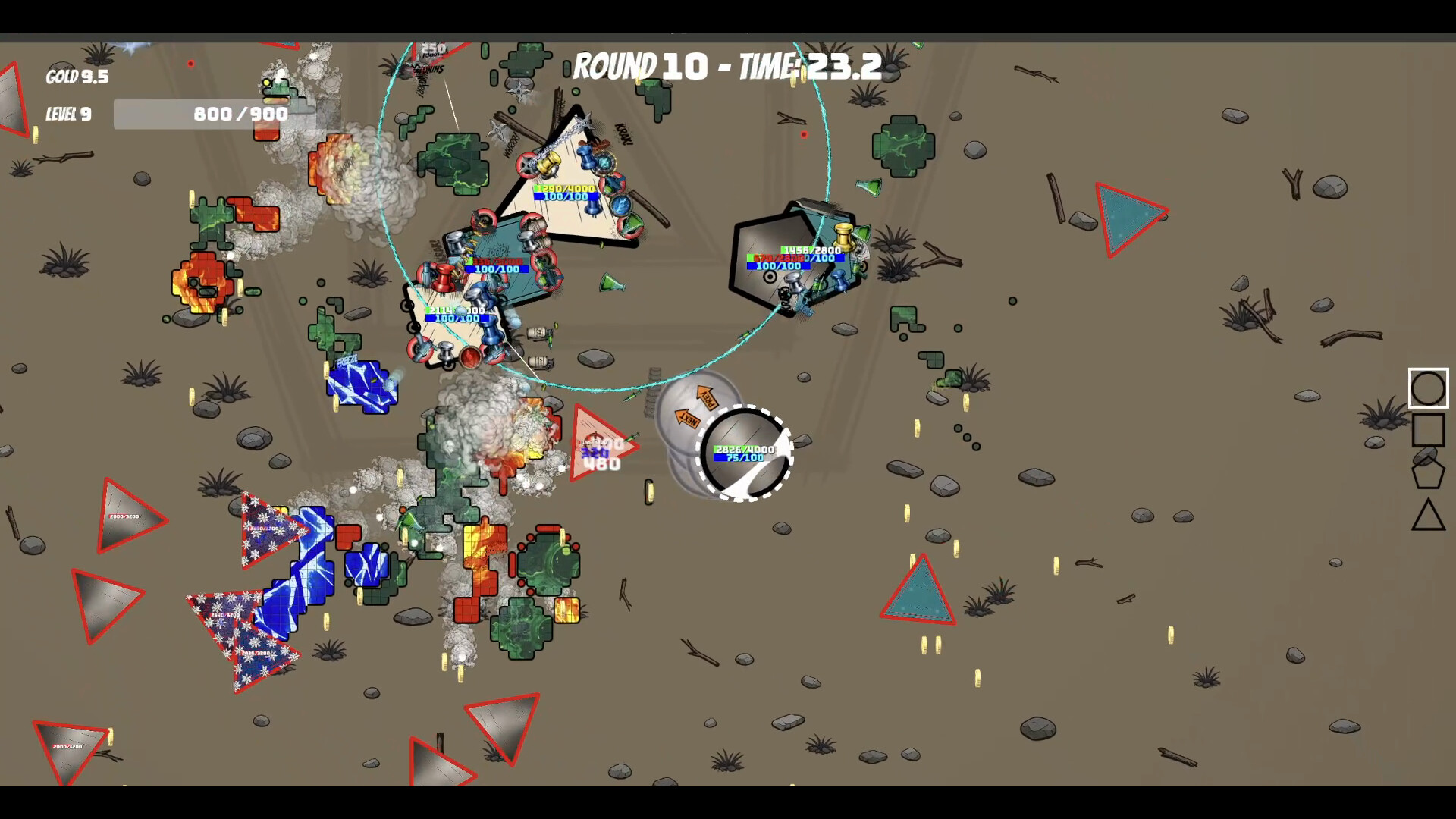 Your warriors are polygons — triangles, squares, pentagons. Every edge is a weapon slot. Katanas, gatling guns, flamethrowers, liquid nitrogen guns, acid blasters — a growing arsenal at your disposal.