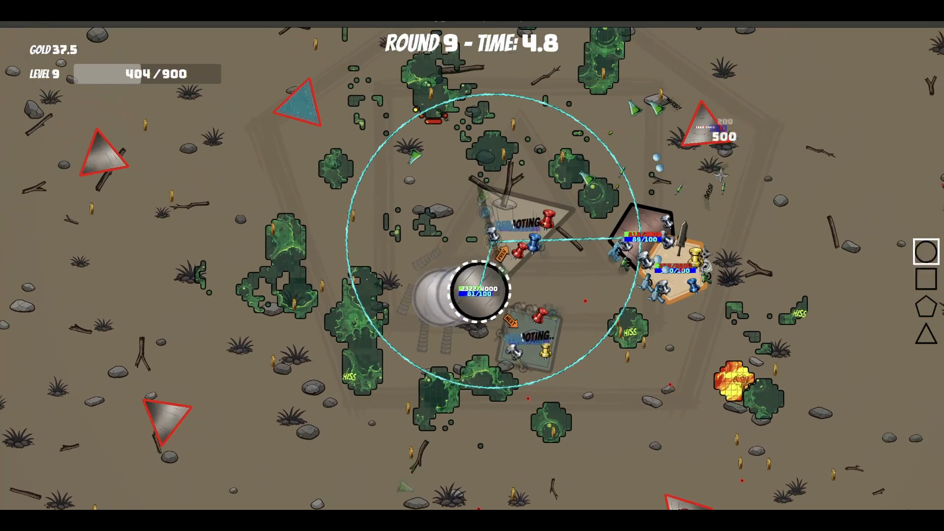 Your warriors are polygons — triangles, squares, pentagons. Every edge is a weapon slot. Katanas, gatling guns, flamethrowers, liquid nitrogen guns, acid blasters — a growing arsenal at your disposal.