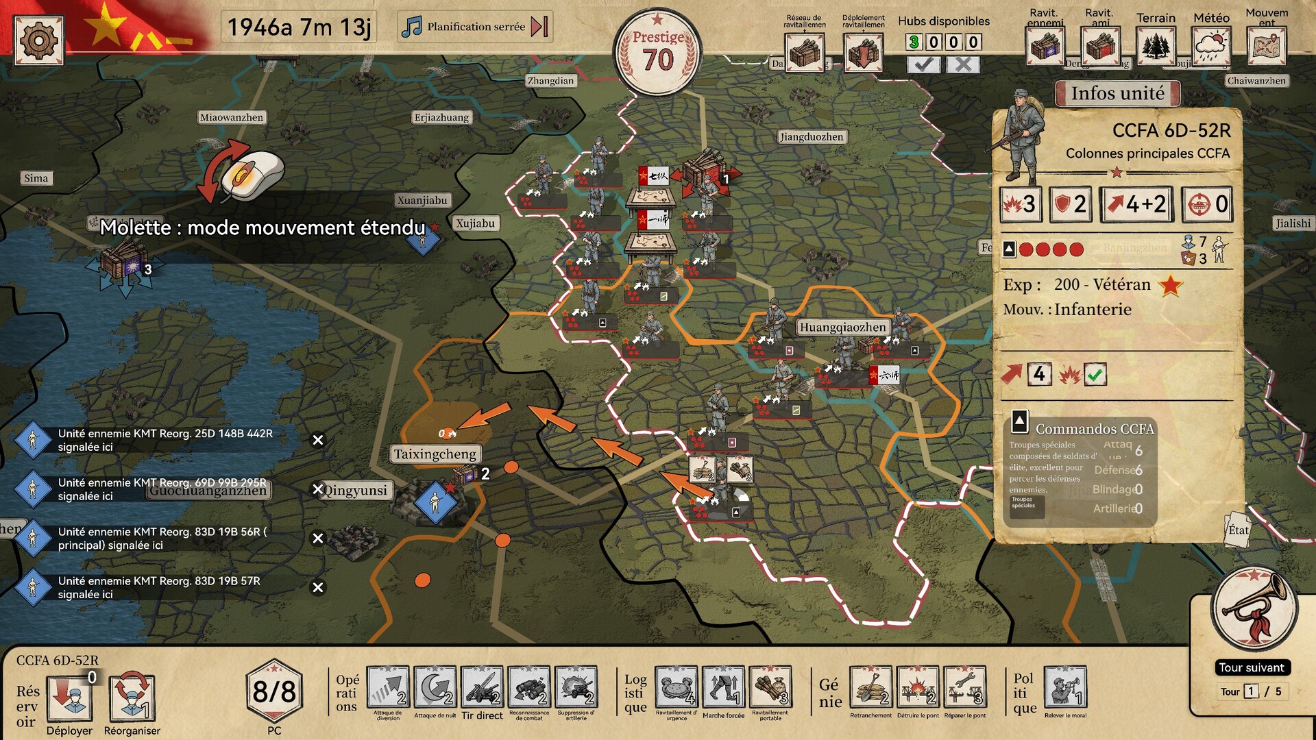 Dans cette démo, nous avons préparé pour vous plusieurs missions issues de la célèbre campagne des « Sept victoires en sept batailles dans le Jiangsu central » ! En juillet 1946, alors que Li Mo'an menait une invasion massive avec 120 000 soldats du Guomindang répartis en trois colonnes dans la région libérée du Jiangsu central, l'Armée de campagne de Chine centrale ne disposait que de 30 000 hommes ! Quel écart de forces ! Vous incarnerez le rôle historique du général Su Yu (« 502 ») et dirigerez cette bataille où la minorité l'emporta sur la majorité. Face à l'avancée inexorable des troupes du Guomindang, saurez-vous pousser l'art de la guerre de mouvement à son paroxysme ? Pourrez-vous, tout en préservant vos forces, anéantir la moitié des assaillants ? Commandant, il est temps de révéler votre talent stratégique !