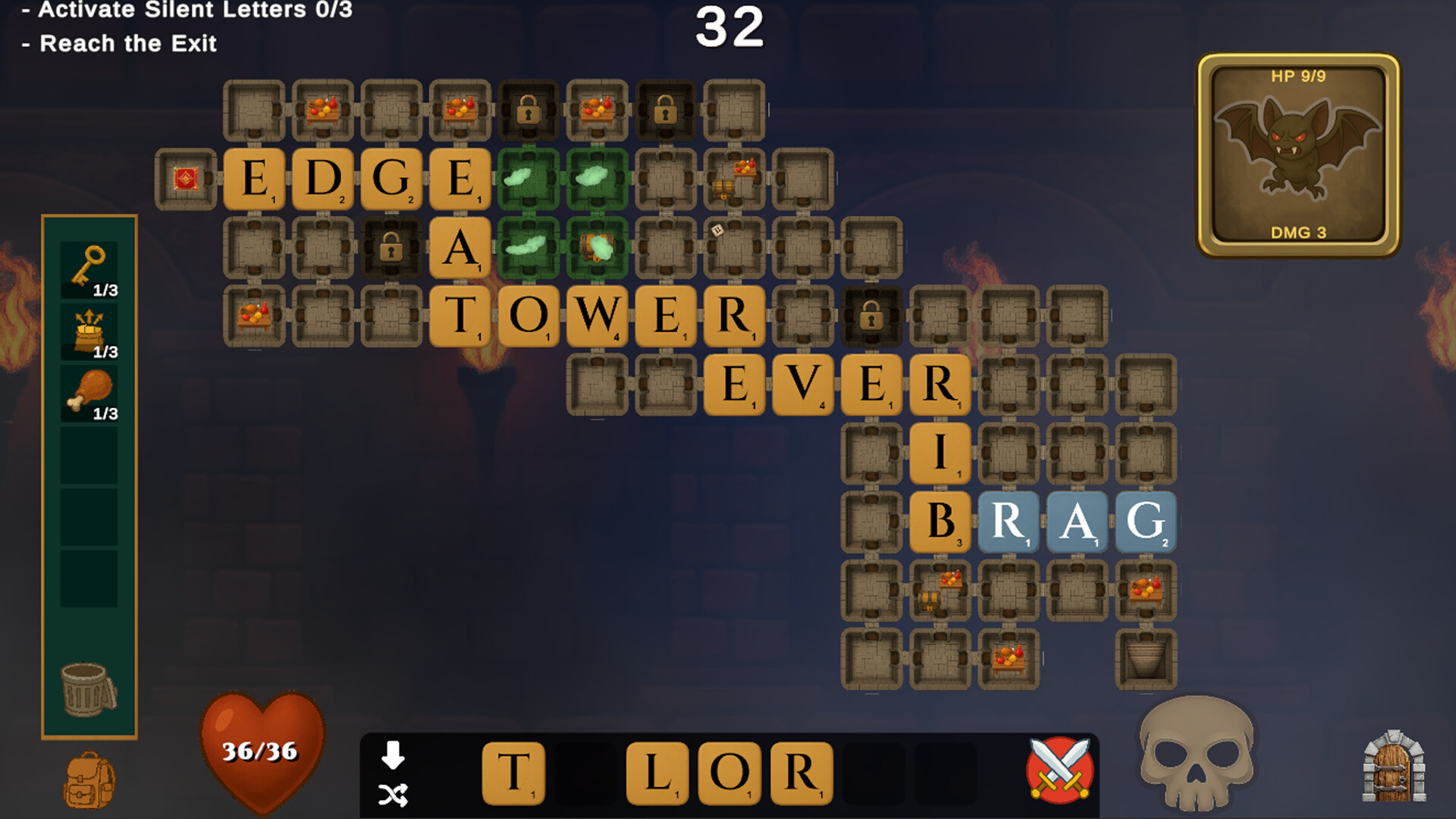 Discover glowing Silent Letters hidden throughout the dungeon. Use matching letters to awaken them for immediate health and score bonuses.