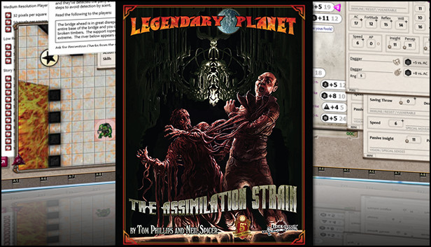 The Assimilation Strain is an introductory adventure for the 5th Edition of the world's most famous roleplaying game which can be played as a standalone adventure for 1st-level characters or as a prelude to the Legendary Planet Adventure Path, introducing heroes from any fantasy world to the cosmic threat of alien invaders from beyond who see nothing on this planet but another world to conquer. The adventure blends exploration and negotiation alongside elements of horror and a desperate battle to survive against a foe bent on their enslavement or extermination. The interplanetary adventure continues in To Worlds Unknown, launching your heroes into a fantastic universe of exotic pulp adventure! The sword and planet genre comes to life on Legendary Planet!