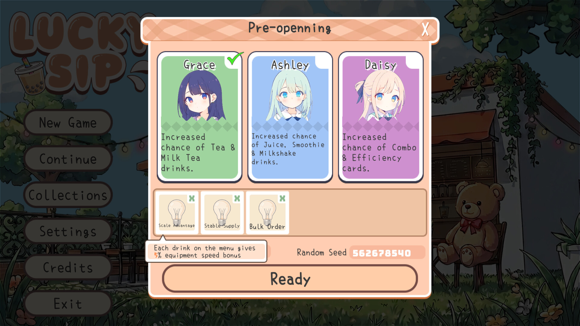 Lucky Sip is a time-management restaurant simulator with roguelike elements. When leveling up, players can choose different buff cards to create a highly varied gameplay experience.