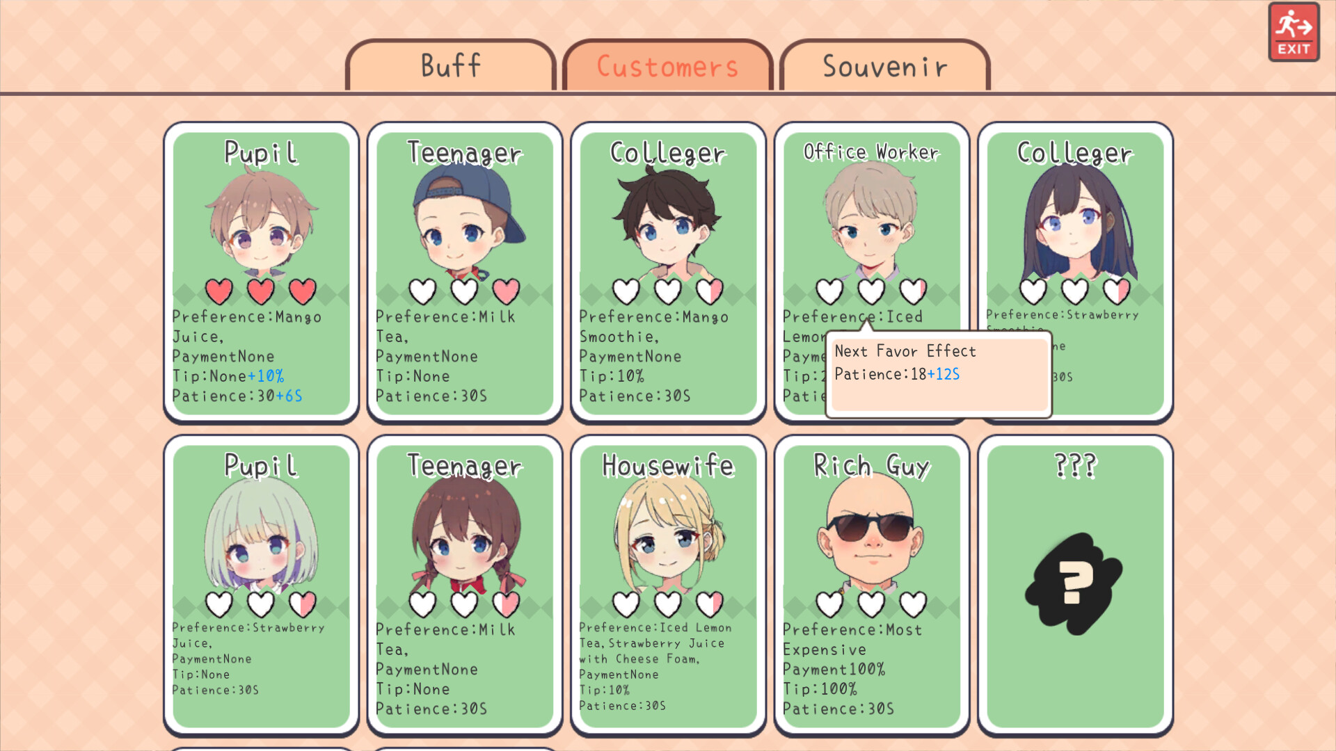 Serve over a dozen customer types with unique behaviors and preferences, including primary school students, middle school students, college students, office workers, housewives, the wealthy, beggars, and thieves. Each customer provides different synergy effects. Gaining their favor can even reward powerful souvenirs.