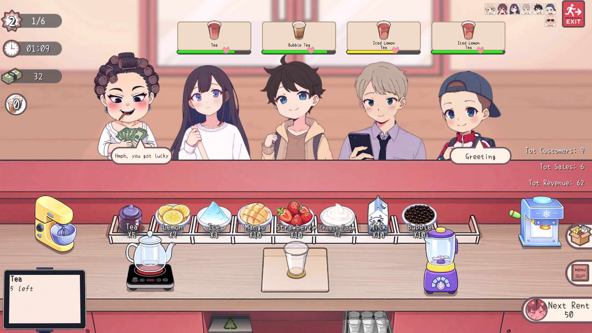 The landlady will appear at fixed intervals to collect rent—and to make matters worse, the rent keeps rising! By strategically combining drinks, customers, and other buff cards, you can defeat the landlady and build the most successful milk tea shop.