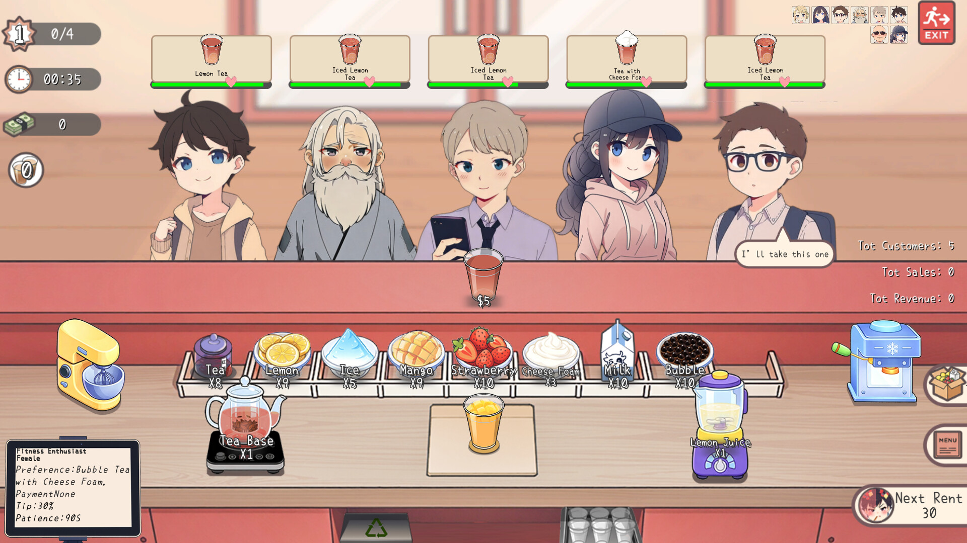 The landlady will appear at fixed intervals to collect rent—and to make matters worse, the rent keeps rising! By strategically combining drinks, customers, and other buff cards, you can defeat the landlady and build the most successful milk tea shop.