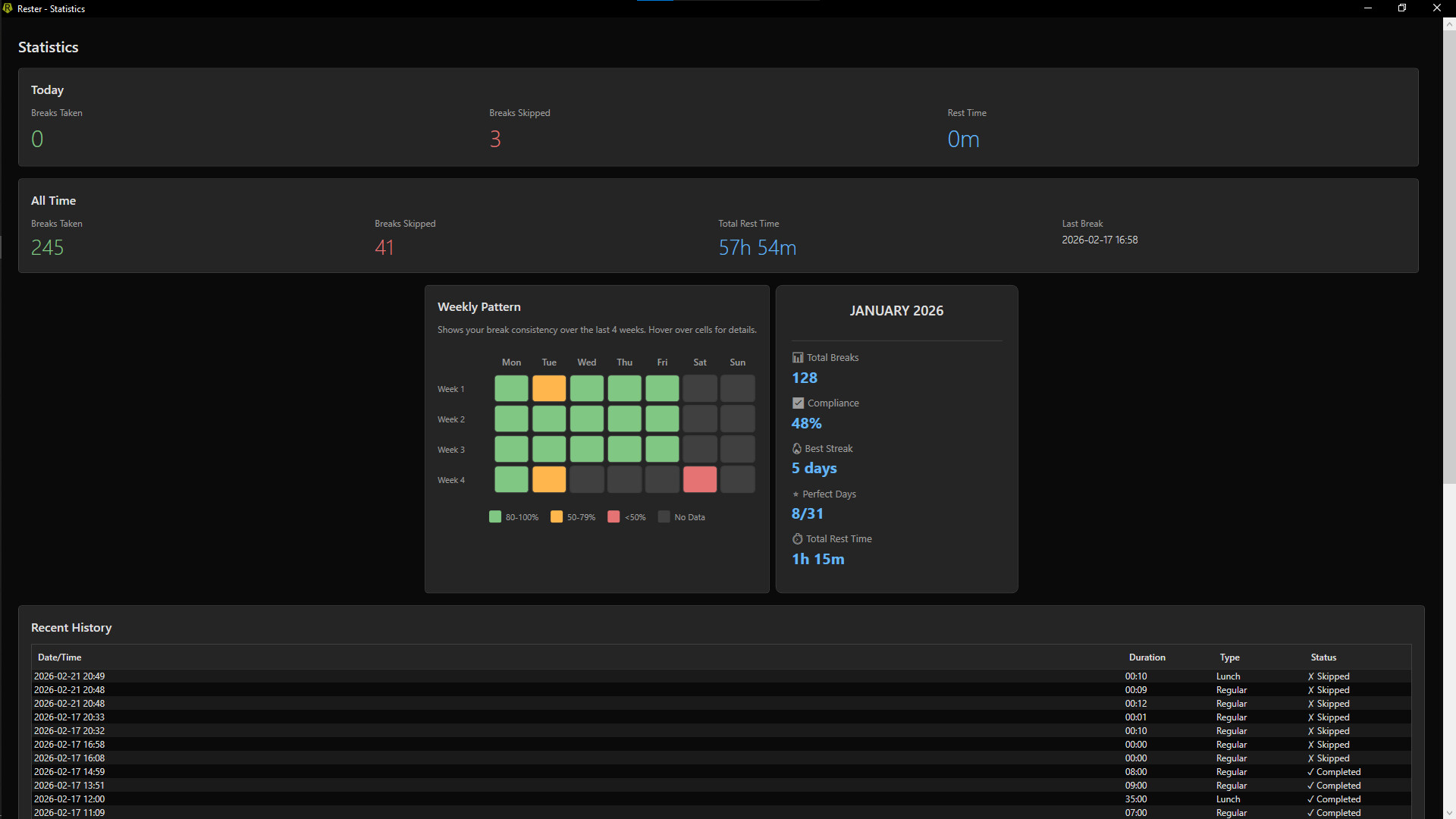 • Built-in statistics that track how many breaks you took or skipped