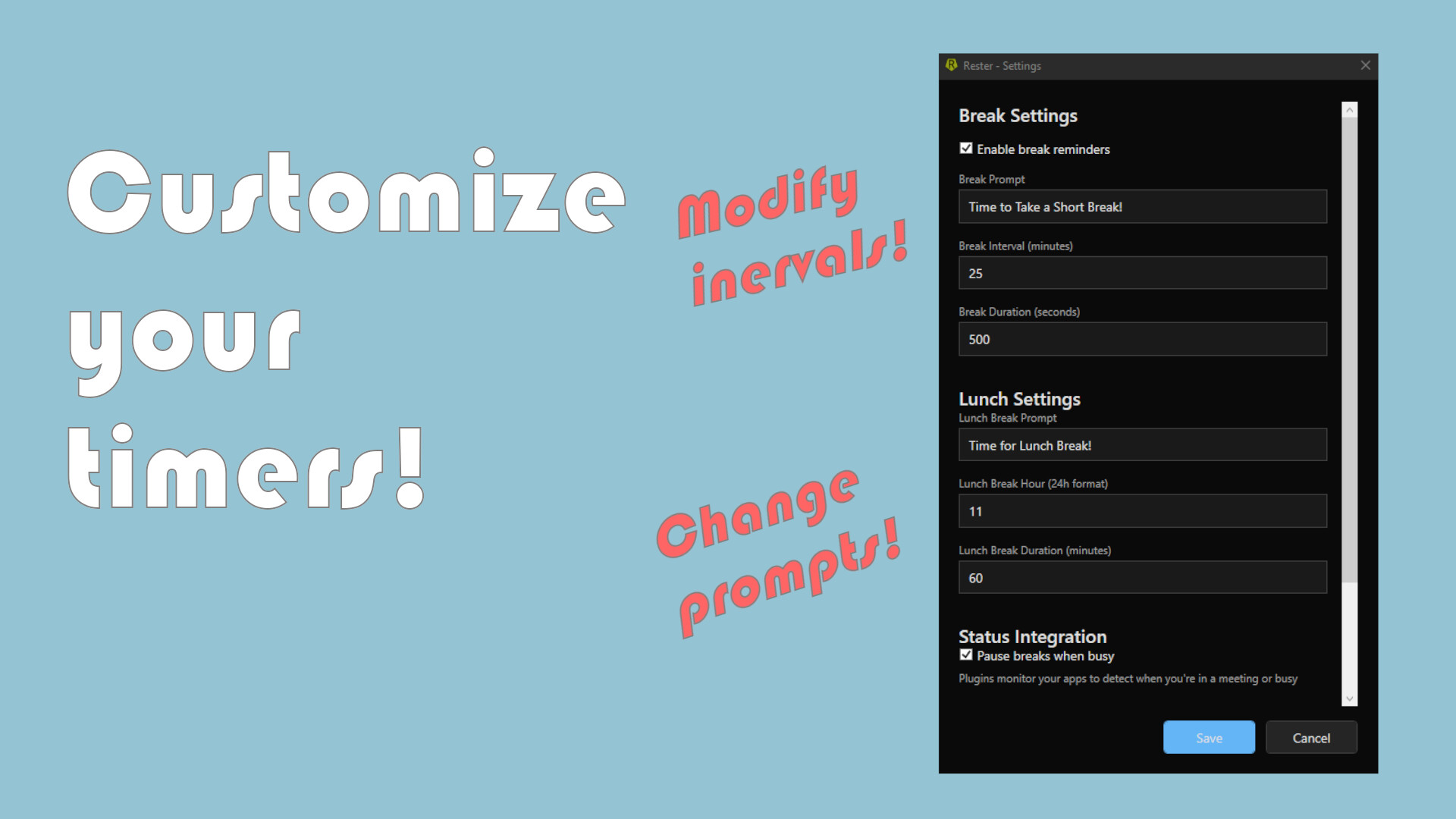 Rester displays a clean, full-screen overlay that temporarily blocks input to underlying applications. The overlay can be dismissed automatically when the break timer ends or manually canceled. It’s designed to interrupt long, focused sessions and remind you to move, rest your eyes, or eat — helping you maintain better habits and wellbeing.