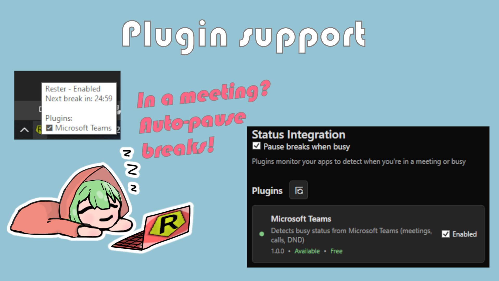 • Plugin support for integrating with other apps (currently an MS Teams plugin that detects status via log files; no Teams login required)