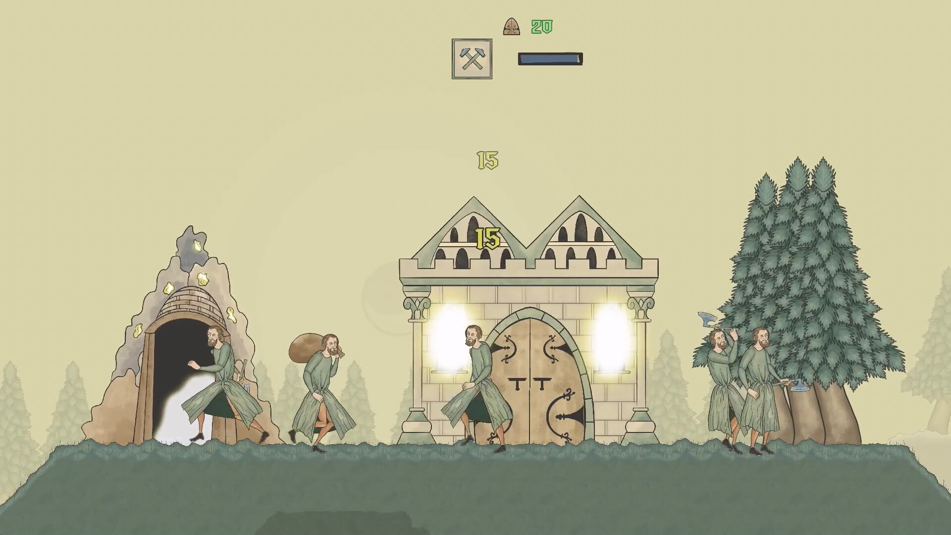 Lass die Bauern Gold und Holz ernten! Errichte Farmen, Schmieden, Sägemühlen und mehr!