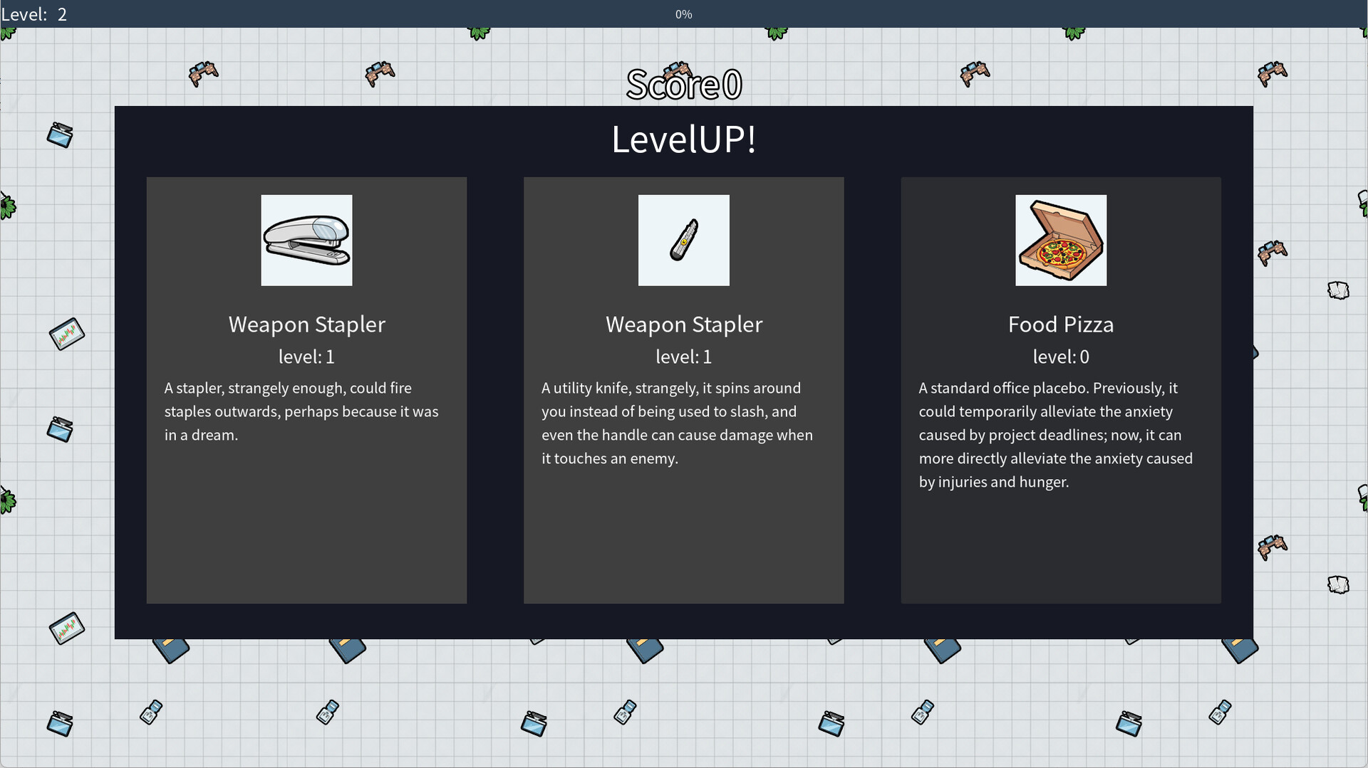 武器:武器同样取材自各类办公用品,后续更新有可能会出现一部分超能力等要素。