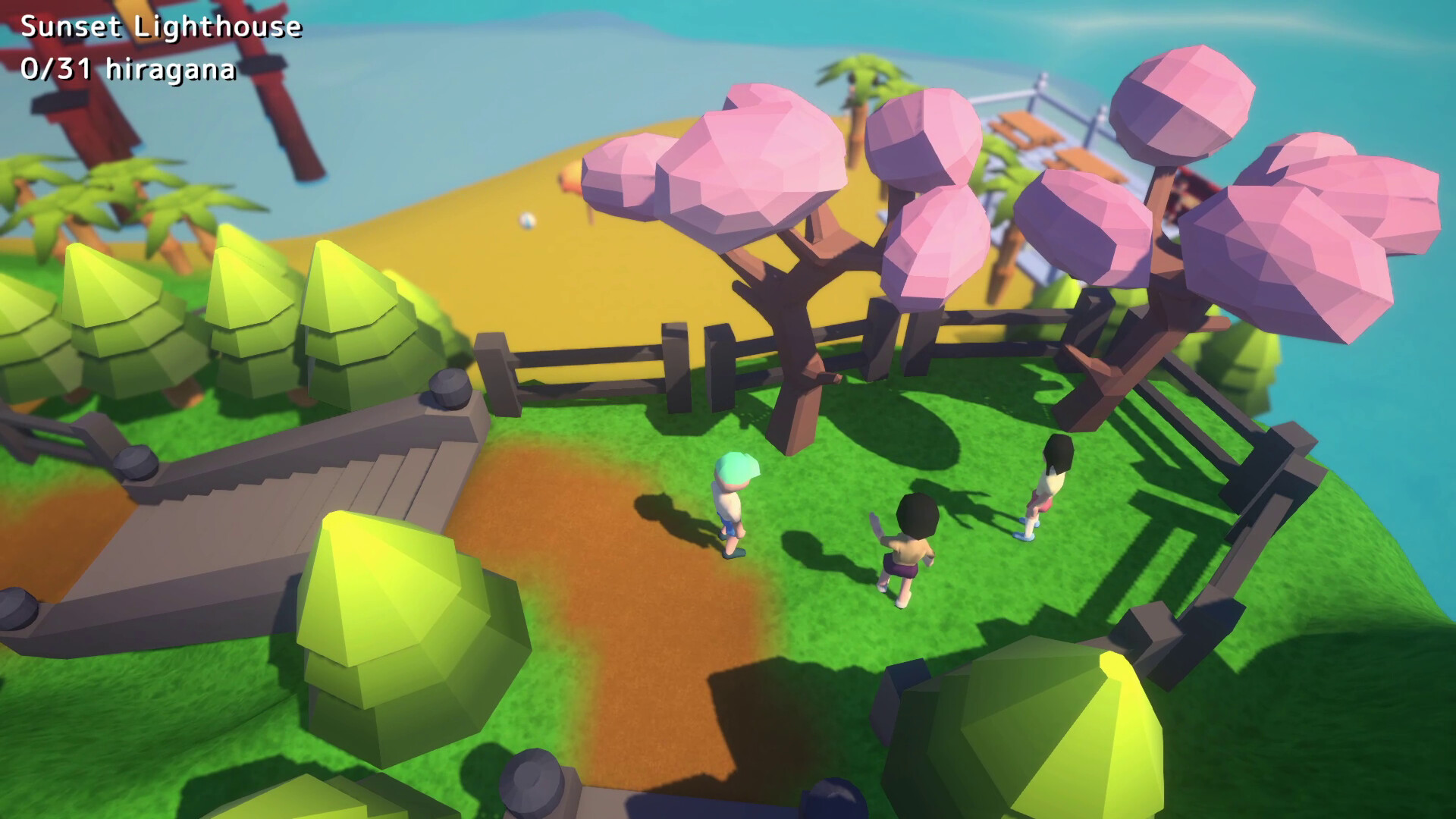 You start on Hirajima Island, which hosts the Hiragana Dojo. On this island, all the locals will teach you Hiragana as you travel through various picturesque locations inspired by the islands of Okinawa, Japan.