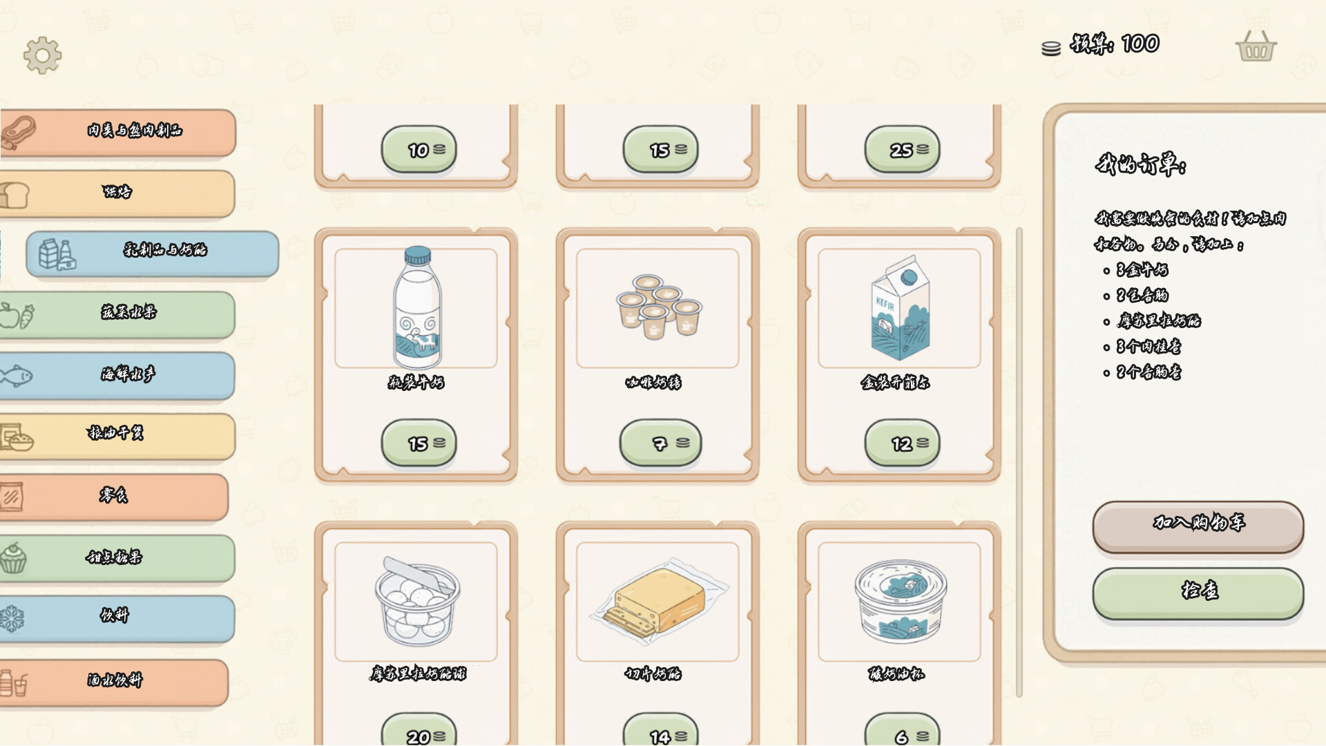 每一关都是来自客户的新任务。你将看到一份包含具体产品和特殊要求的清单:例如,购买牛奶和面包,但不要忘记添加“一些招待客人的茶点”。仔细研究客户的喜好和预算,准确收集所需物品。