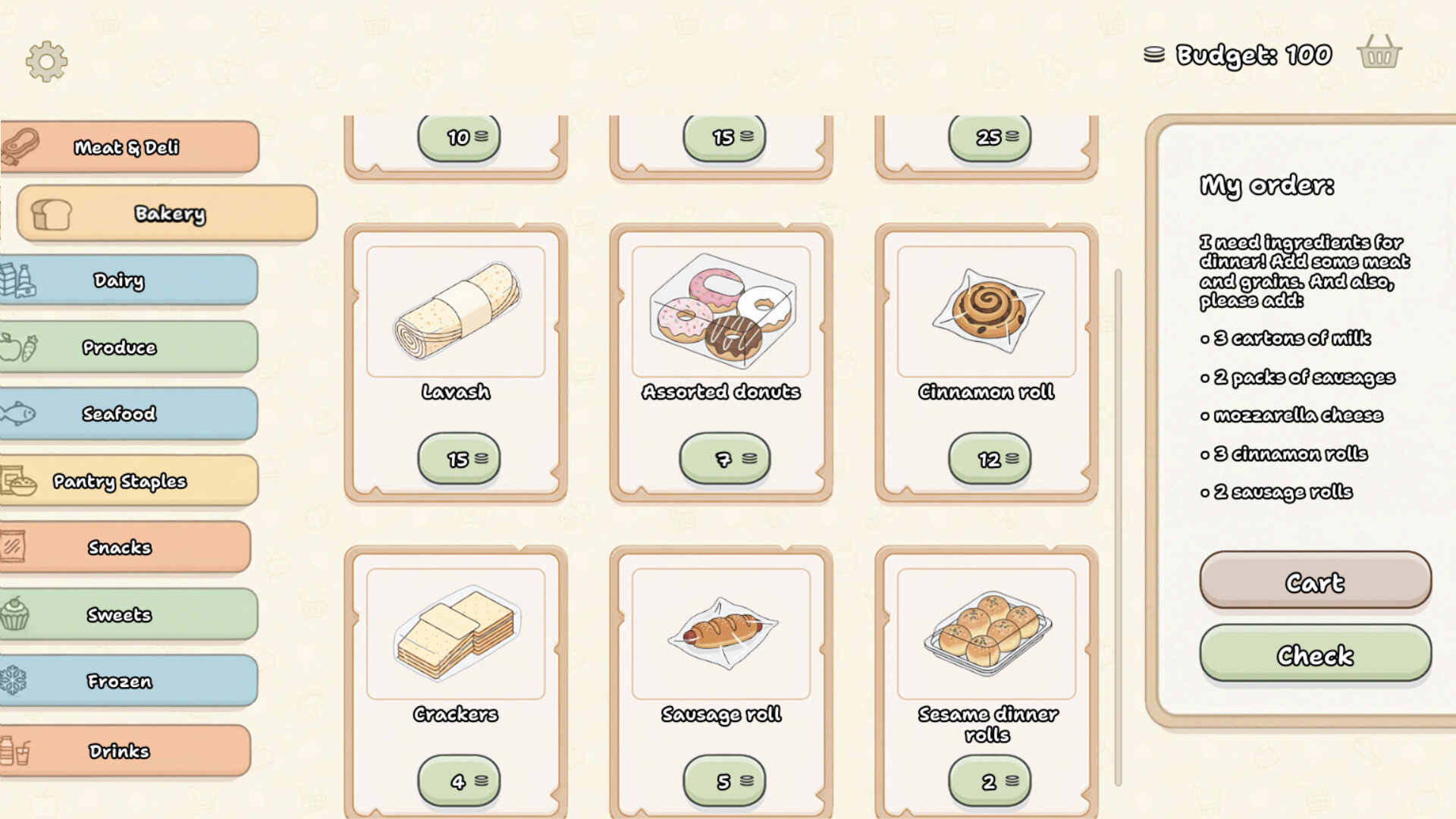 Press the check button to submit the order. The system will immediately tell you if you did everything correctly: if it lights up red, it means the budget has been exceeded or some item from the customer's list was overlooked. Simply fix the error at your own pace and bring the order to perfection!