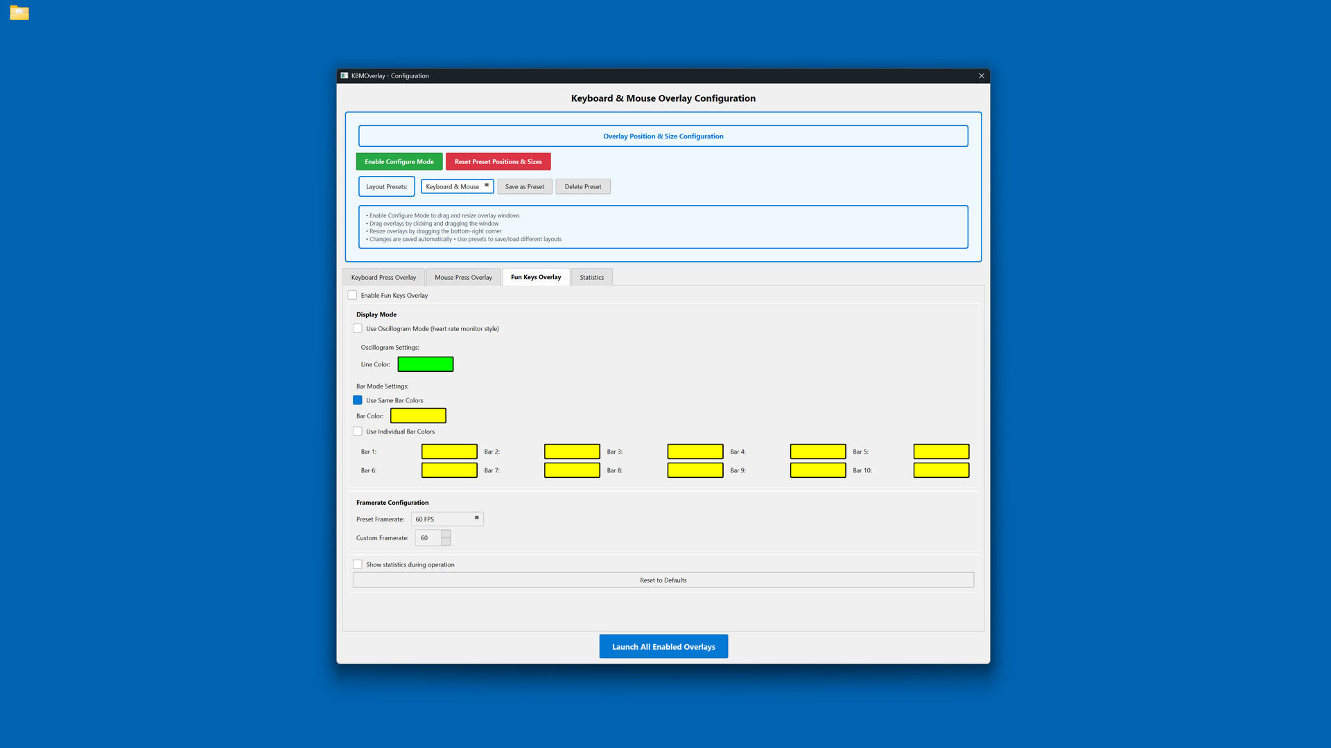 Launch the configuration window, select your desired overlays, customize colors and positioning, then let the overlay run in the background.
