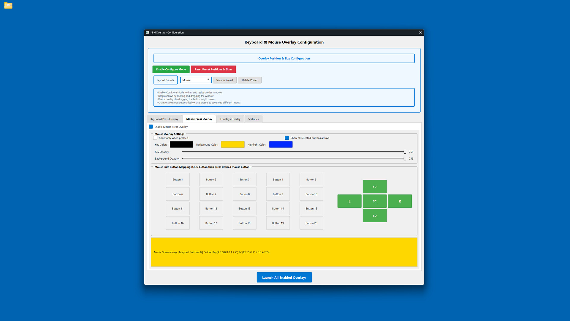Launch the configuration window, select your desired overlays, customize colors and positioning, then let the overlay run in the background.