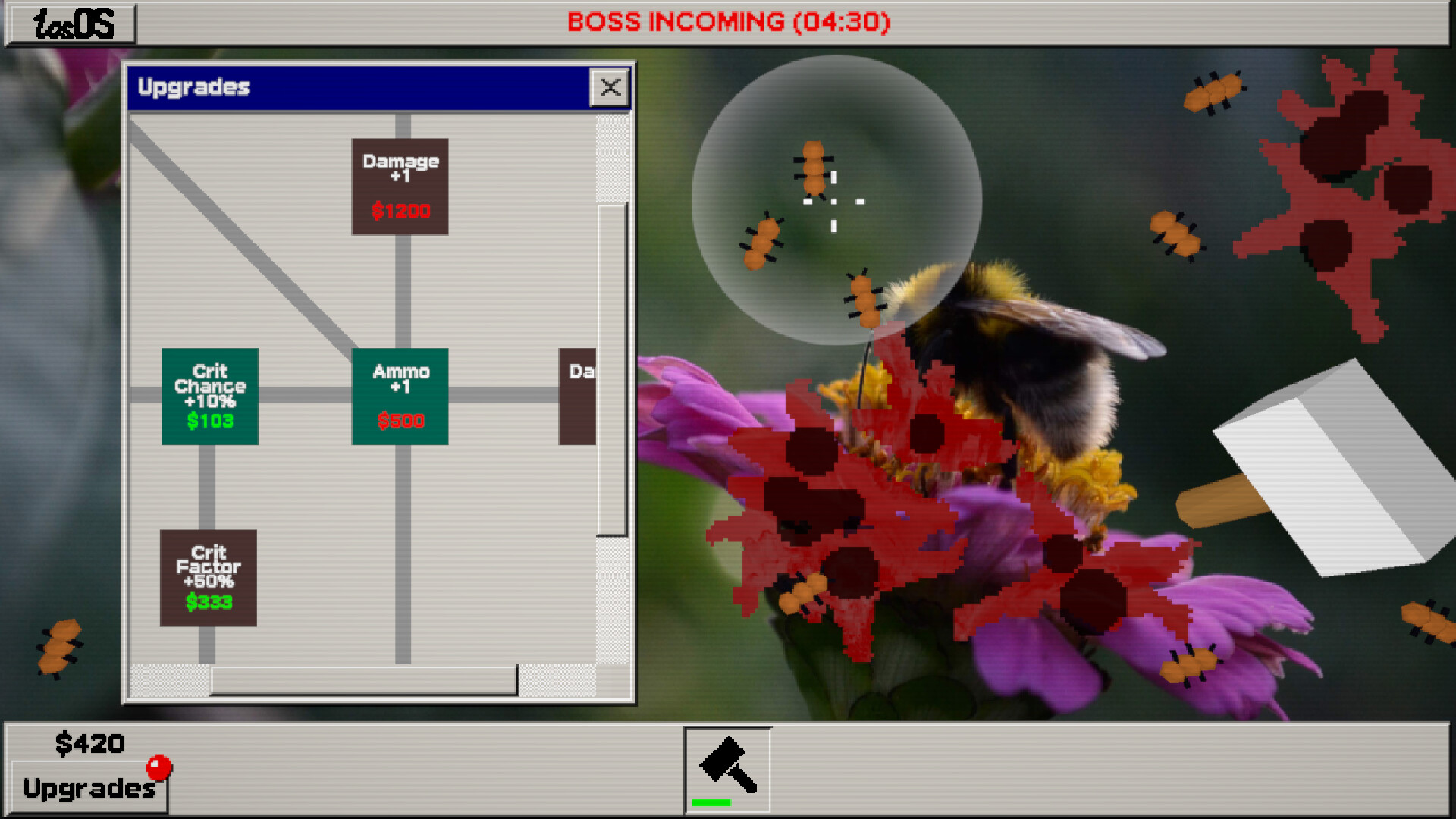 All kinds of bugs decided to take place on your monitor: from ants and termites that just walk around, to melolonthas that fly in and out, big centipedes that even split, - the game features a variety of enemies to deal with and get more dollars from.