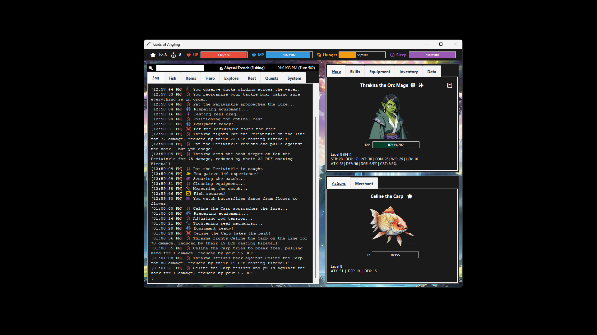 Level up, grow your stats, catch legendary fish, move through natural biomes, steal from the travelling merchant, equip an exotic imbued fishing rod. It's all here! The numerous vectors have your hero grow and experience the life of an angler. Did you leave them alone to do their for for a week? A month? Catch up on their progress by checking out their journal and see their haul of new attributes, skills and loot.
