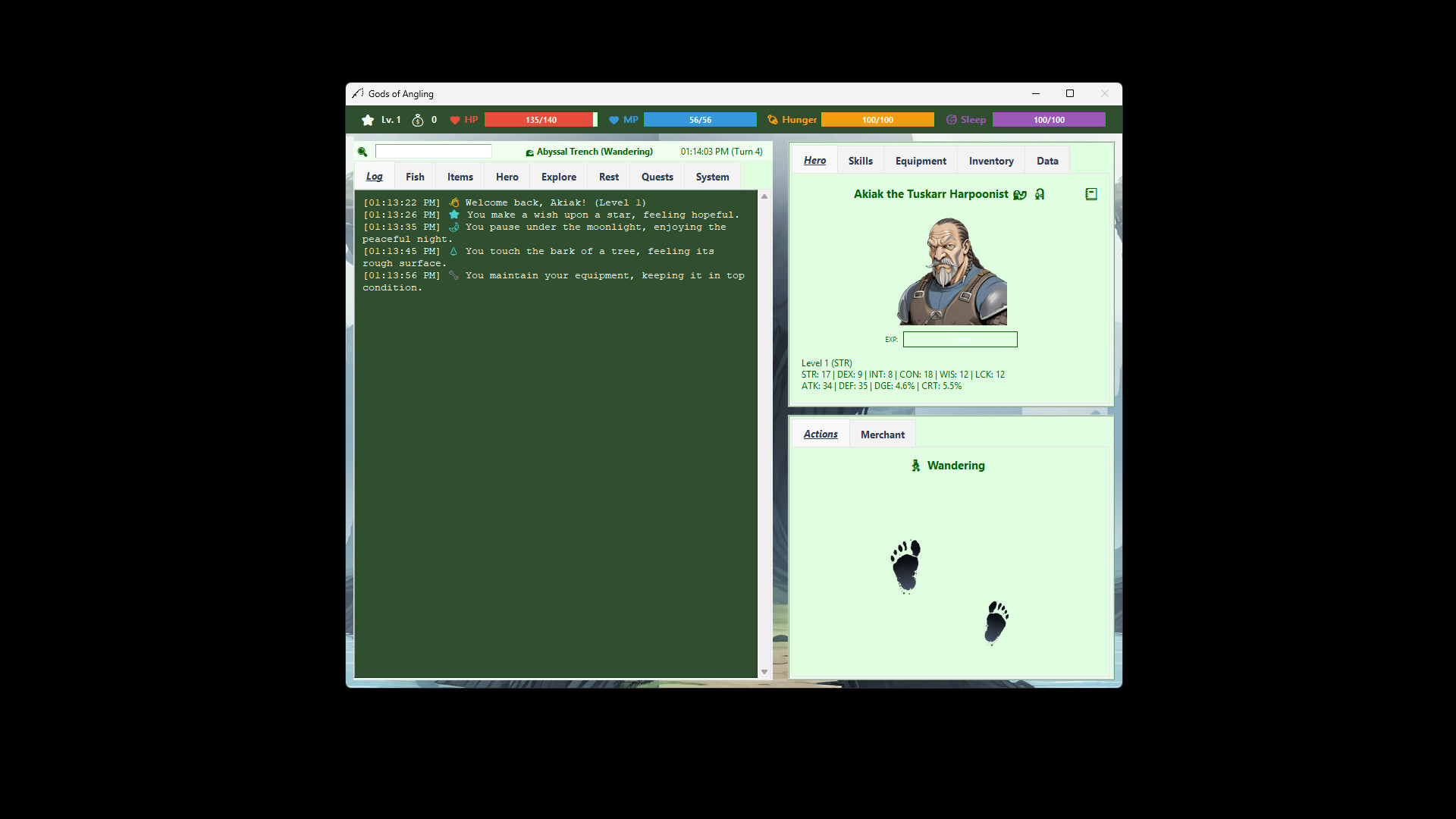 Level up, grow your stats, catch legendary fish, move through natural biomes, steal from the travelling merchant, equip an exotic imbued fishing rod. It's all here! The numerous vectors have your hero grow and experience the life of an angler. Did you leave them alone to do their for for a week? A month? Catch up on their progress by checking out their journal and see their haul of new attributes, skills and loot.