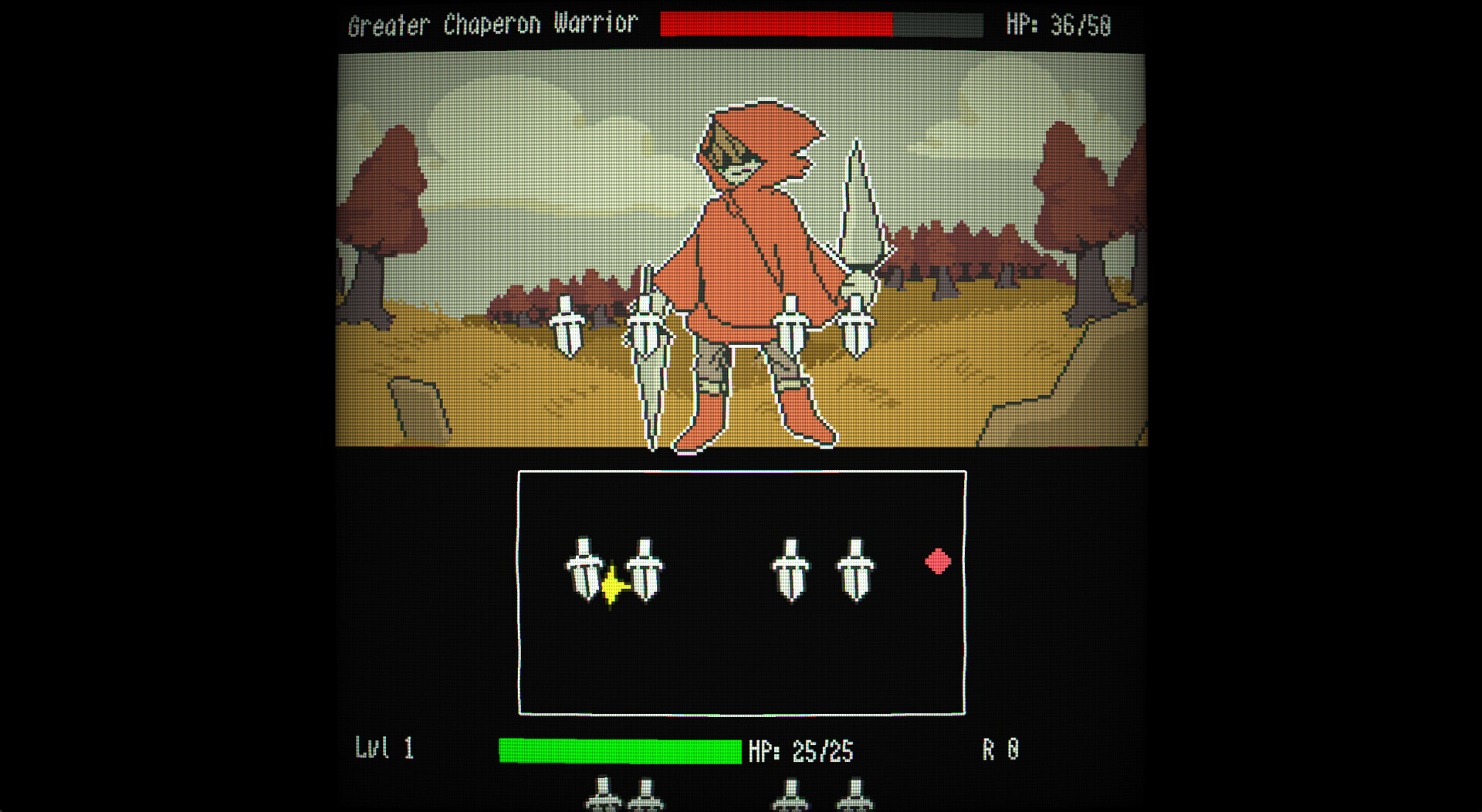 After defeating an enemy you'll acquire a currency called R. How much you receive depends on the enemy and how many hits you took. A battle resulting in a no-hit will grant you the max R reward for this enemy. Use your currency to restore your health or level up one of two stats : attack power or base health.