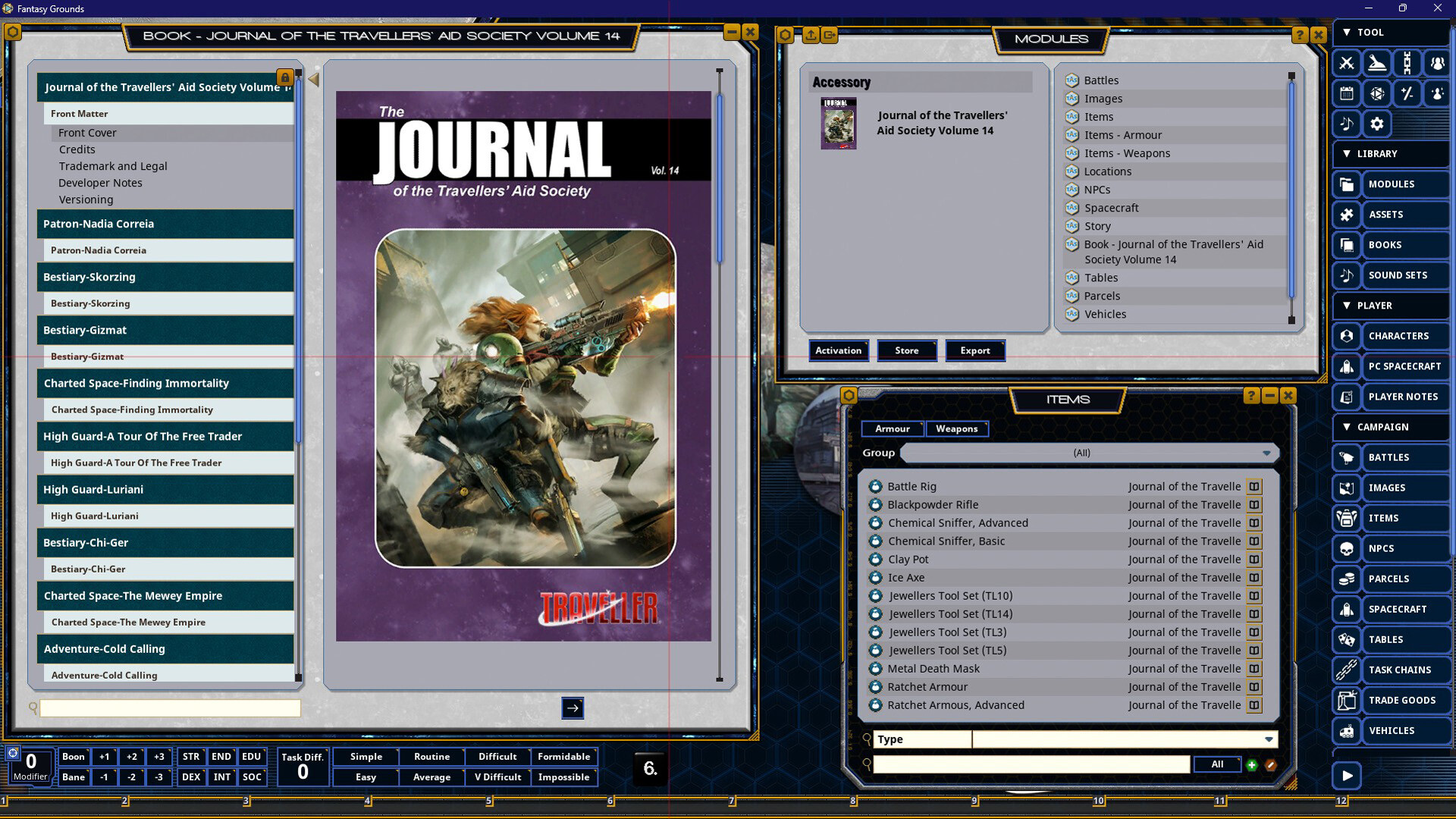 Requires: The free Fantasy Grounds virtual tabletop (VTT) software and a one time purchase of the Traveller 2E (Mongoose) ruleset.