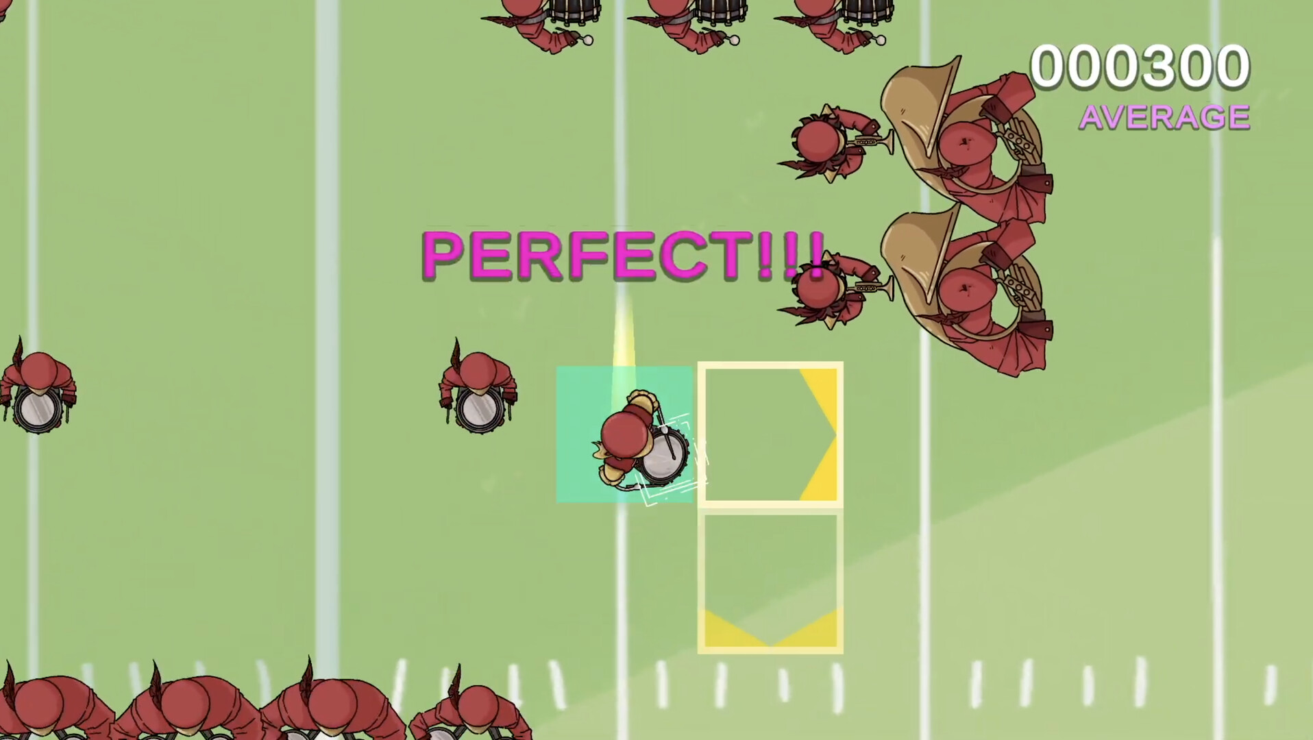 For each level, you play as a small part of a huge band, all choreographed to move to the beat! There are multiple difficulties to choose from (timed input + directional input, just one of those, or watch levels like cutscenes!). Stick to your path and everything will flow perfectly, but if you can’t keep up, you just might be able to get back to your spot before anyone notices!