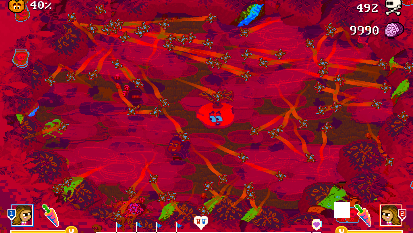 You will be thrown into a combination of old school arcade action, bullet hell chaos, cute retro pixel art and romantic love affair where the only thing that matters is to survive the never ending waves of mutants while defending a giant carrot and making out with your partner. Wait, what?! To release the tension during breaks, you can kiss your beloved bunny partner anytime in the game with the patented POWER KISS MECHANIC! You will need a steady hand and some mad skills to get on that high score list. Shoot your way through hordes of hungry mutants and saturate the forest floor with their gushing blood!