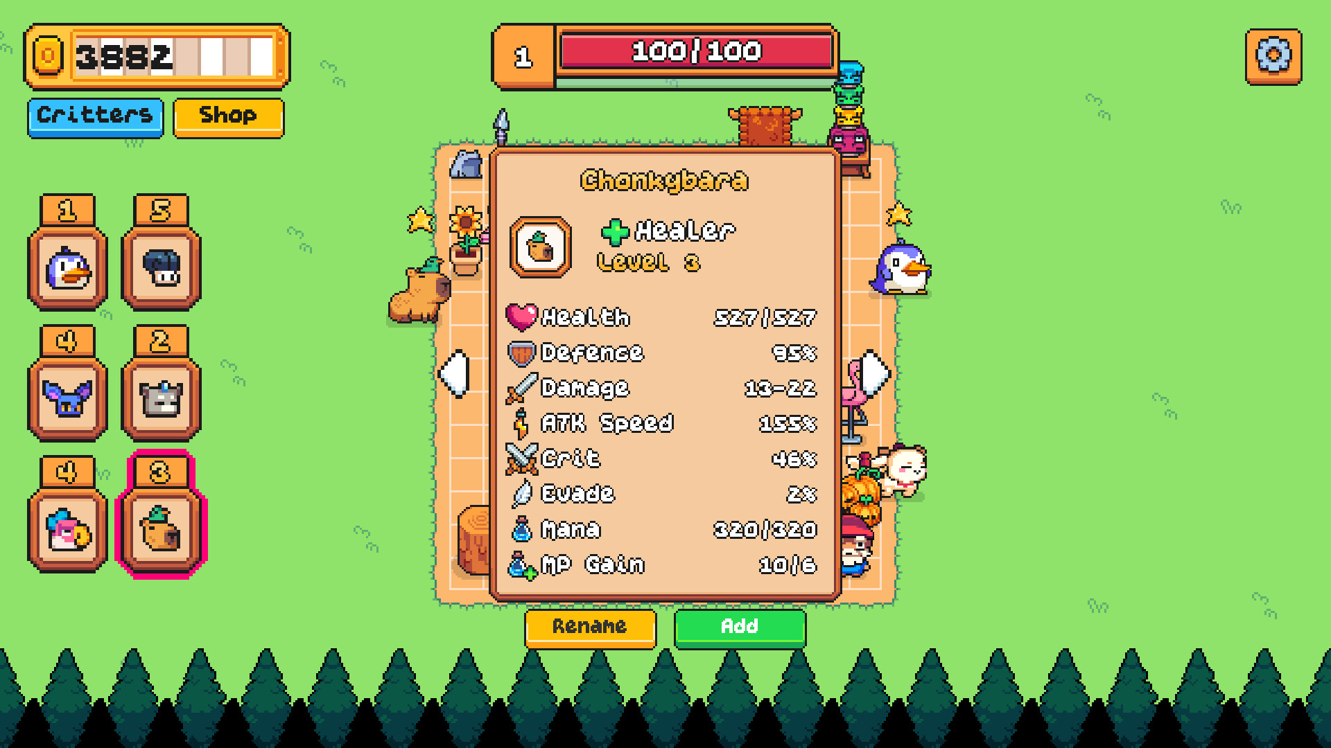 Choose up to 6 Critters per battle from a roster of up to 30. Tanks, Healers, and DPS each play a role, and fallen Critters are gone for the run. Breed new ones or take a risk in the shop to discover rare powerhouses.
