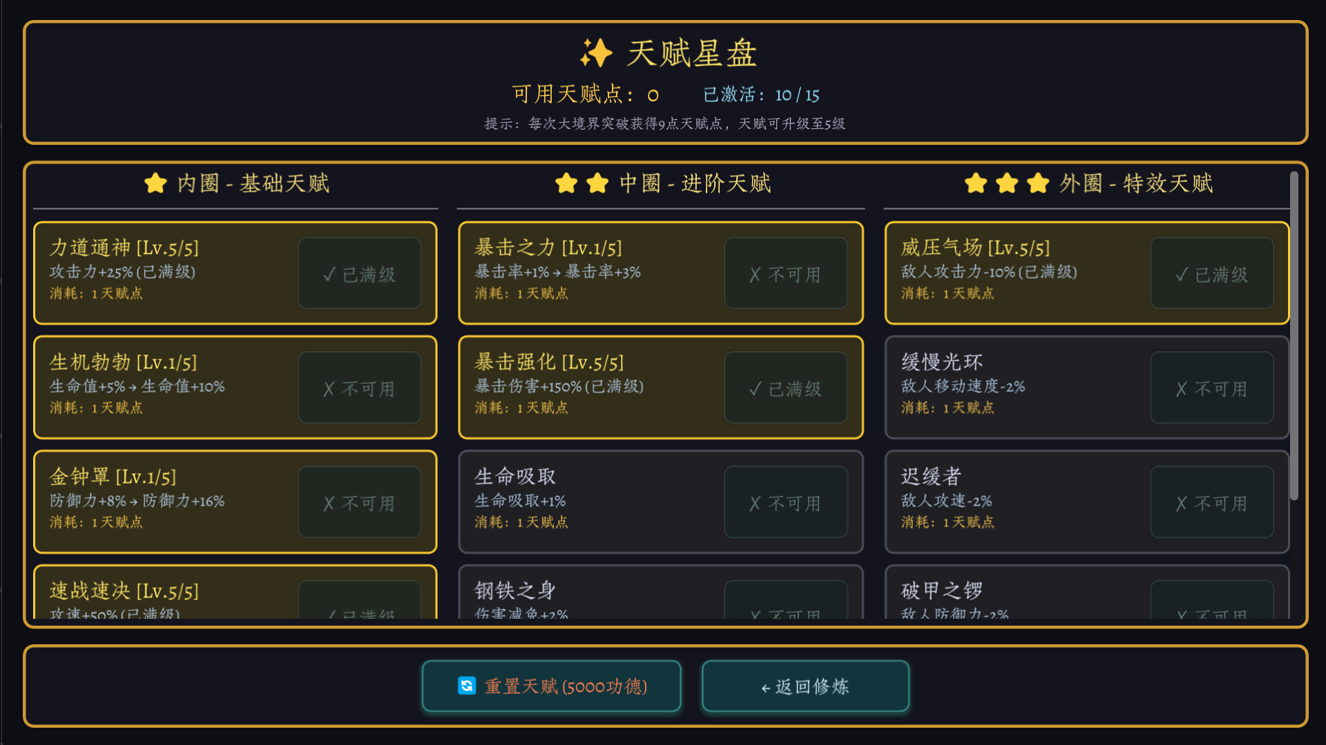 • Upon reaching the Sage realm, you can unlock Rebirth: reset part of your progress in exchange for Rebirth Points and permanent bonuses, surpass your previous limits, and advance to a higher level of cultivation.