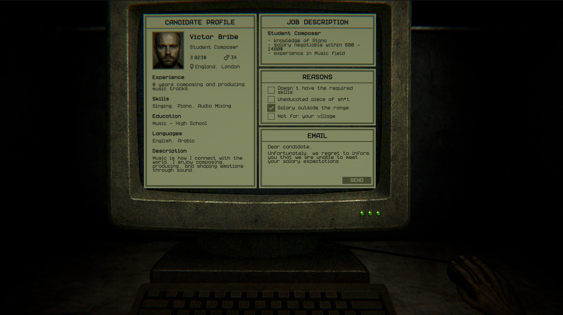 A game about finding reasons to say "no." Review resumes, detect inconsistencies, and deliver rejection letters.