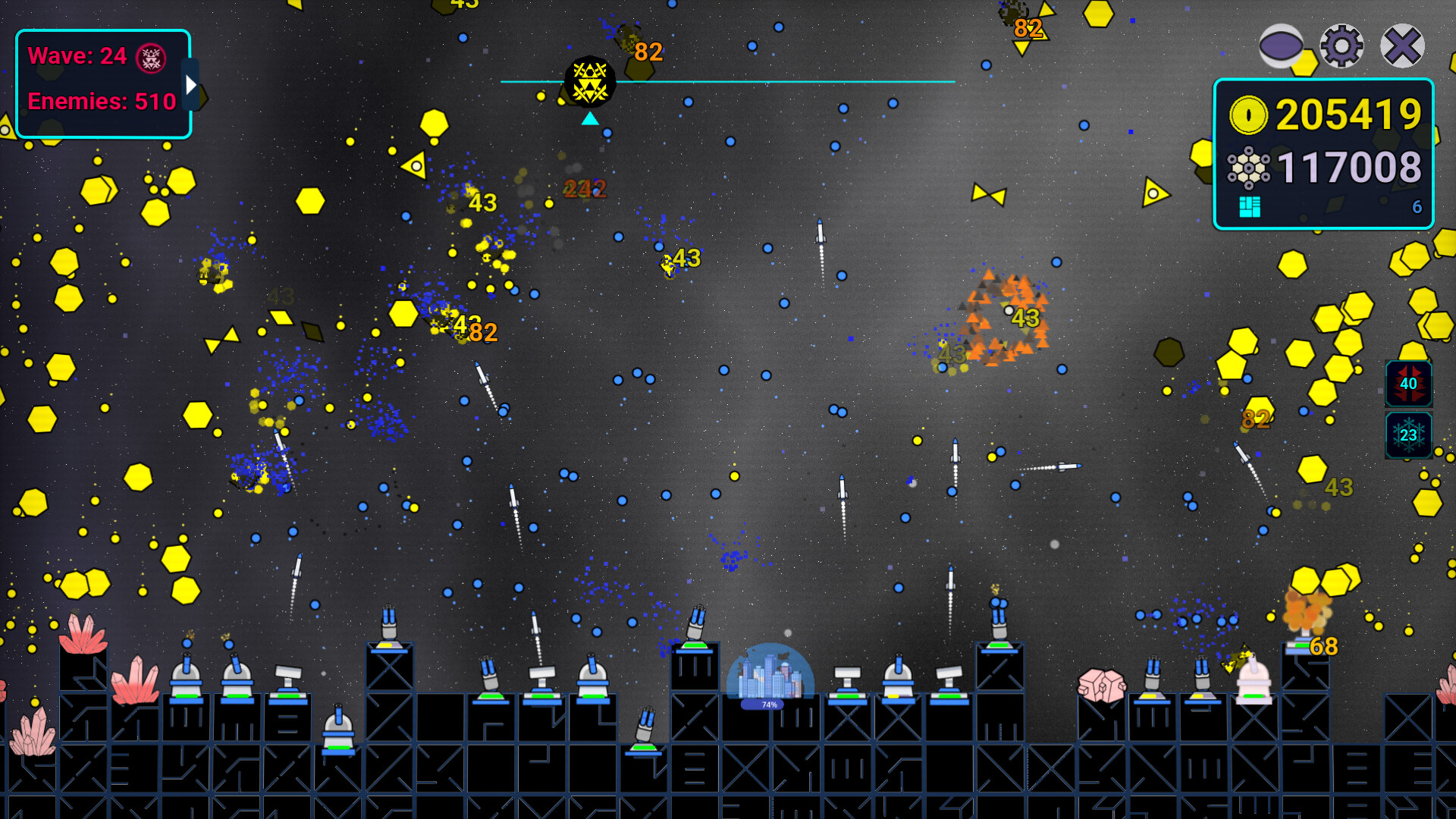 There are no predefined paths here. Enemies attack from the air and approach from different angles, forcing you to decide where to concentrate your fire and which areas to leave more exposed. Each wave tests the coverage and placement of your towers.