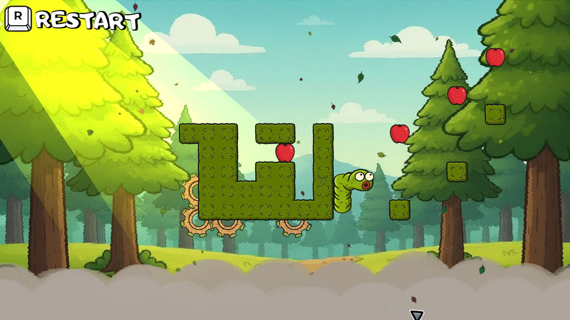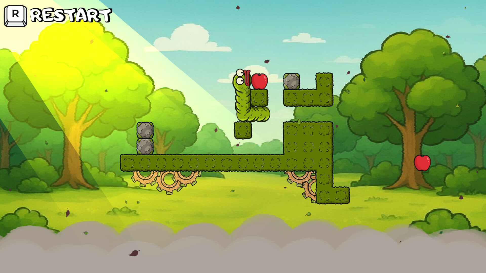 Help the worm reach the apple! Navigate through tricky paths, avoid spikes, and use stones to climb higher. Each apple makes the worm bigger, but it may cause challenges. Can you help him?