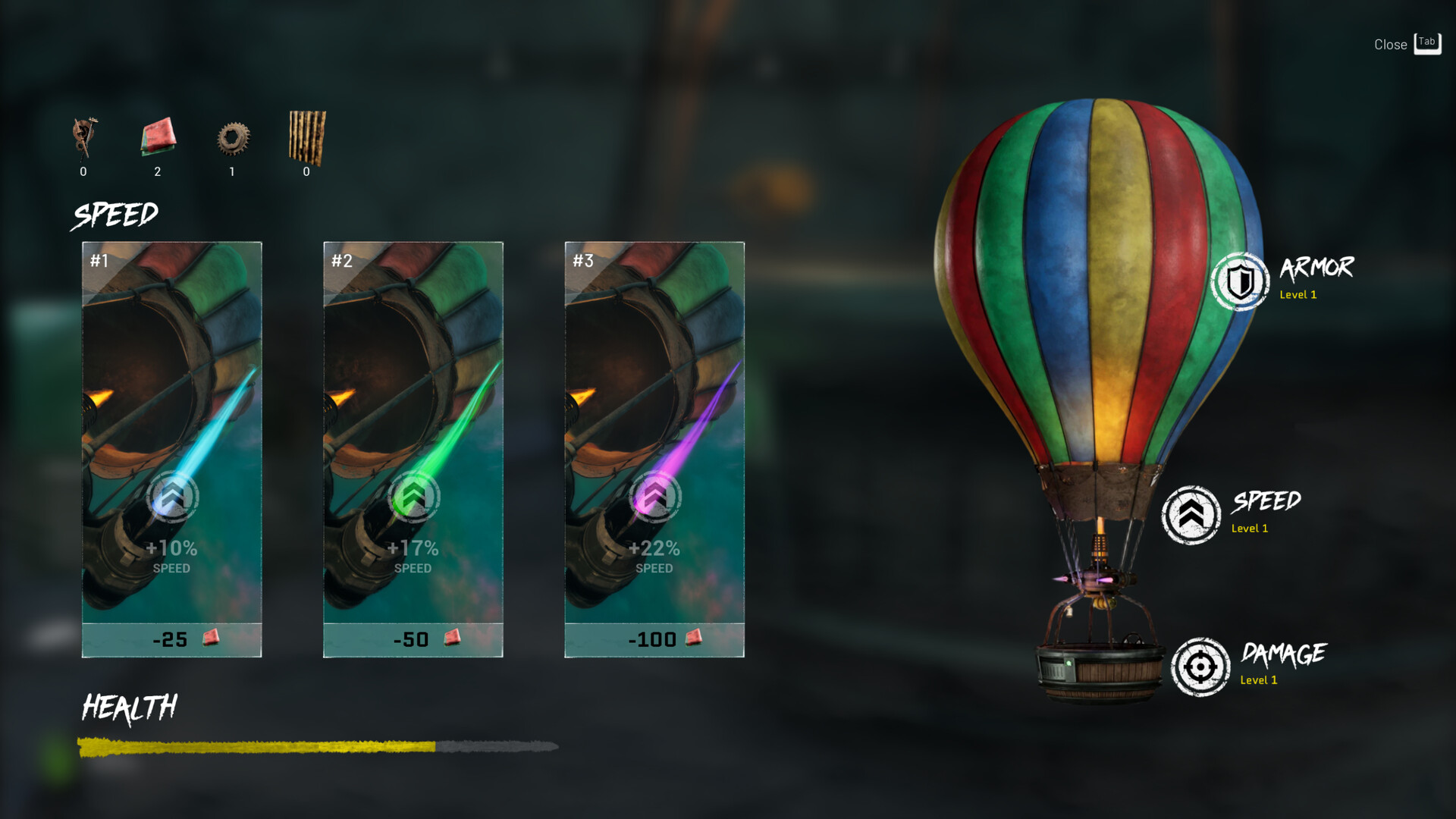 Scrap, metal sheets, gears, and cloth are used to repair damage and improve your flying machine.