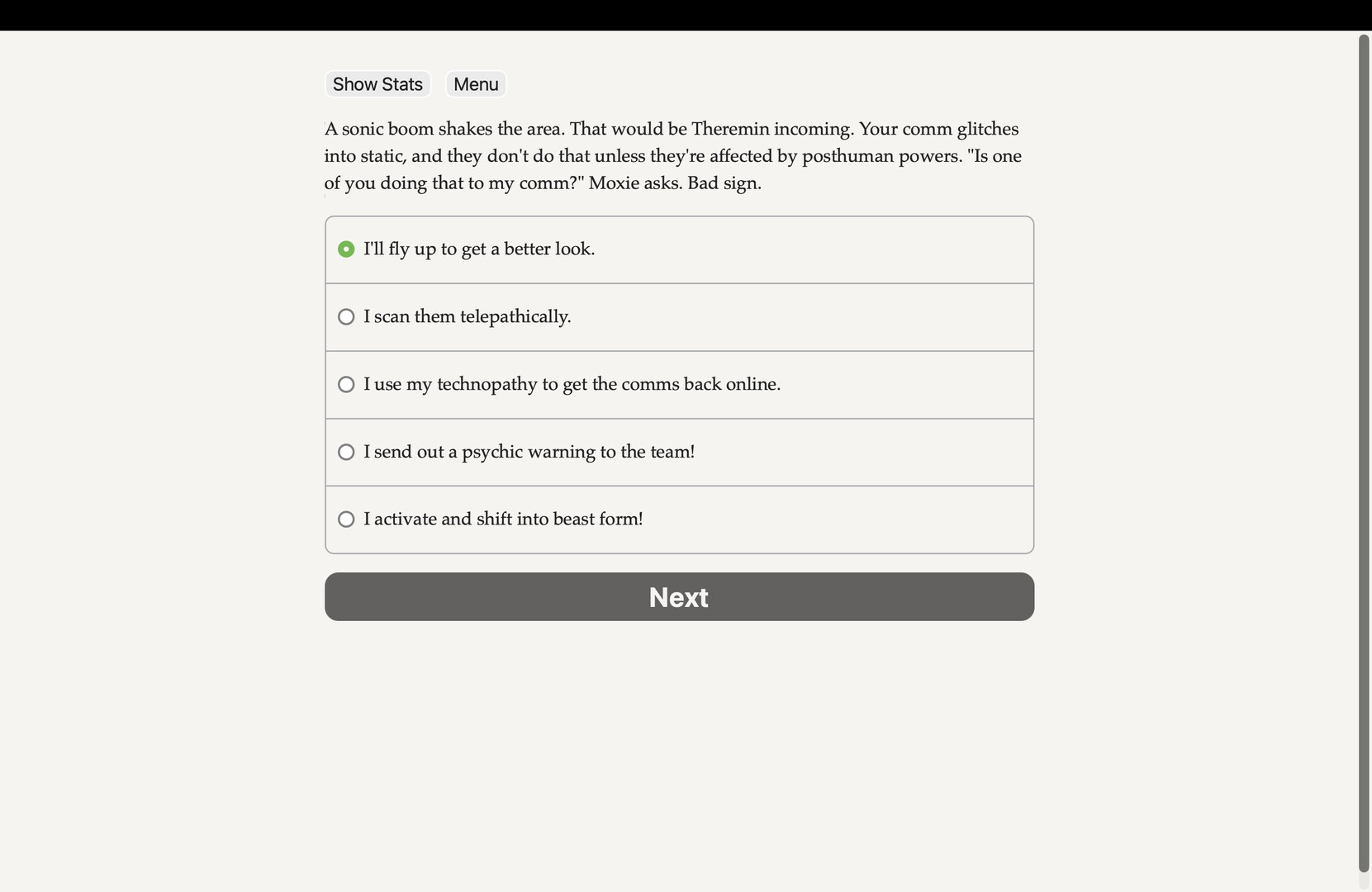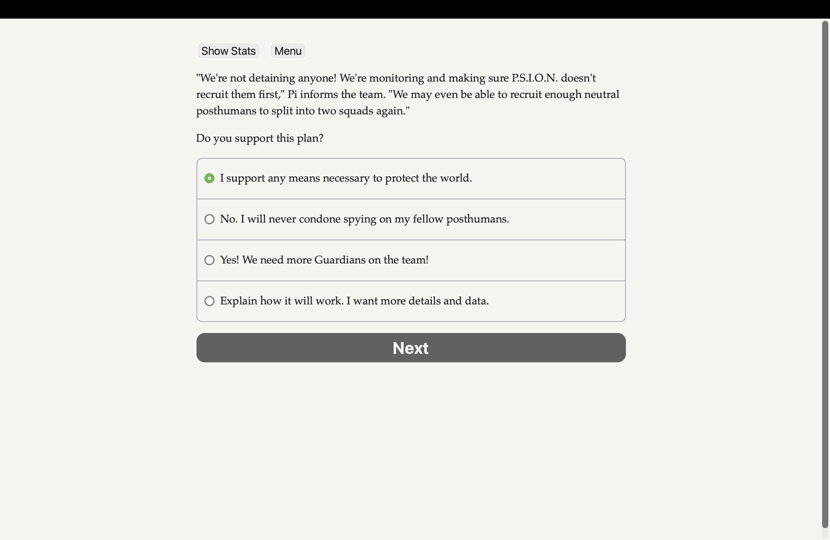 Posthuman: Guardians vs PSION is a 220,000-word interactive novel by Evan J. Peterson, author of Drag Star!. It's entirely text-based, without graphics or sound effects, and fueled by the vast, unstoppable power of your imagination and bravery. Your choices decide who wins the next Posthuman War.