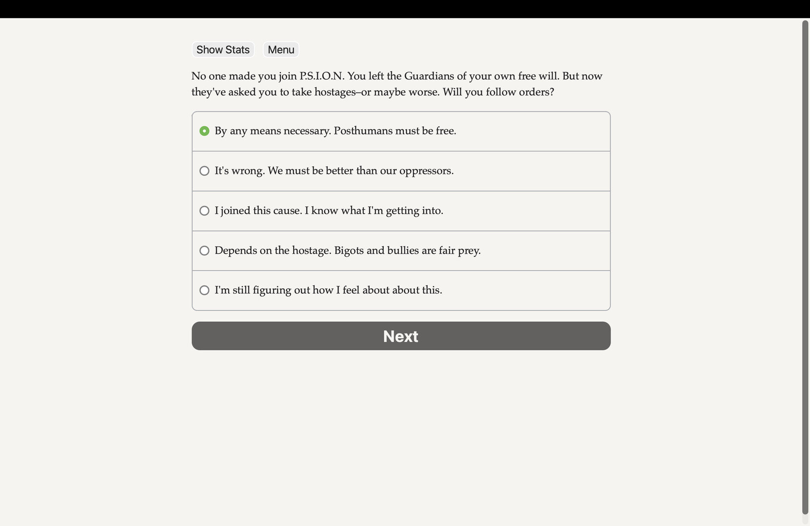 Posthuman: Guardians vs PSION is a 220,000-word interactive novel by Evan J. Peterson, author of Drag Star!. It's entirely text-based, without graphics or sound effects, and fueled by the vast, unstoppable power of your imagination and bravery. Your choices decide who wins the next Posthuman War.